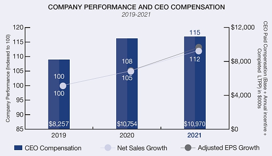 For purposes of demonstrating the alignment of CEO pay with company performance, three elements of direct compensation are included in CEO Paid Compensation on the graph below – 1) Base salary, 2) Annual incentive earned, 3) Stock (based on the market value on the vesting date) earned at the end of the three-year LTPP cycle, which began on December 1, 2018 and ended on November 30, 2021. Total compensation, including the value of pension changes, stock option grants, restricted stock unit grants and all other compensation for all Named Executive Officers, can be found in the Summary Compensation Table on page 49. The adjusted EPS growth referenced herein is a financial measure used as a performance target included in our fiscal 2021 annual incentive and is calculated to exclude certain items required under United States generally accepted accounting principles. Please see page 42 of our Compensation Discussion and Analysis for additional information concerning this performance target.