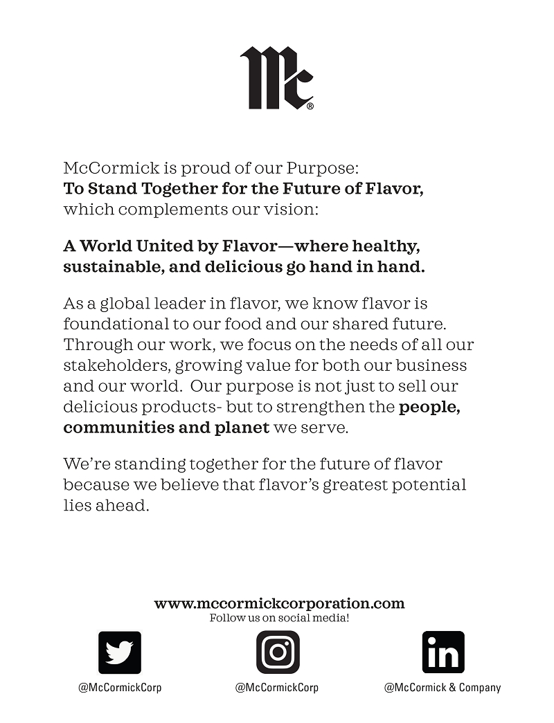 We envision a world united by flavor where healthy, sustainable and delicious go hand in hand. Delivering top-tier financial results while doing what’s right remains a top priority. With our overarching focus on growth, performance and people, we are confident we will continue to build long-term shareholder value while accelerating growth for a purpose-driven future.