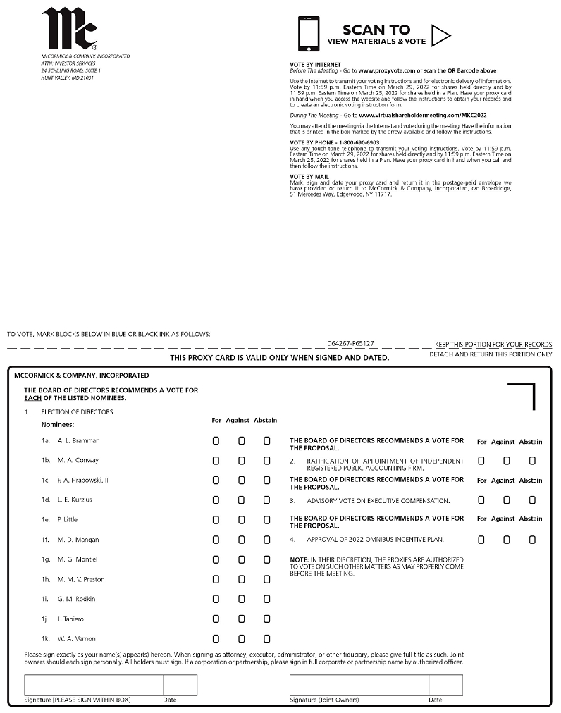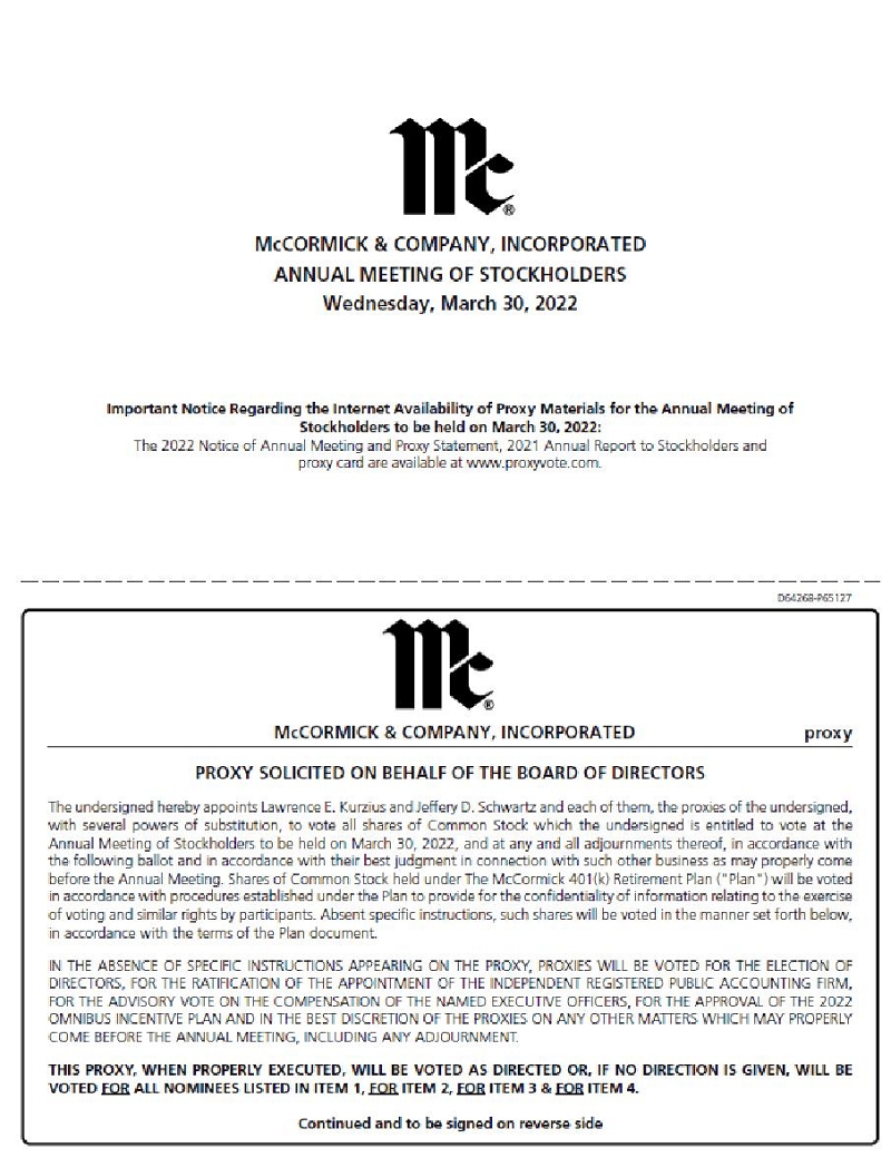 | In light of the continuing public health concerns regarding the coronavirus pandemic, the Annual Meeting of Stockholders (the “Annual Meeting”) of McCormick & Company, Incorporated (“McCormick”) will again be held in a virtual meeting format only at 10:00 a.m. on March 30, 2022, for the purpose of considering and acting upon: | |||