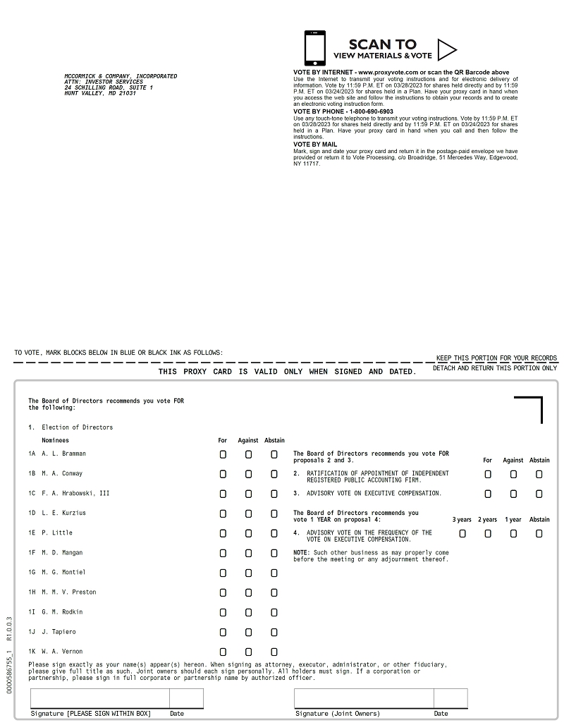 | The proxy statement and McCormick’s Form 10-K for the 2022 fiscal year are available at www.proxyvote.com. These materials are also available on McCormick’s Investor Relations website at ir.mccormick.com under “Investor Resources.” | By