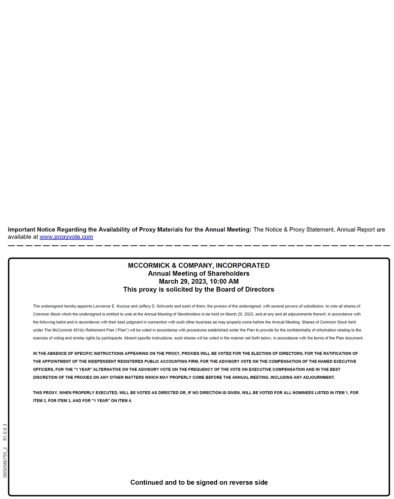 This proxy statement is furnished on or about February 17, 2023 to the holders of Common Stock in connection with the solicitation by the Board of Directors of McCormick of proxies to be voted at the 2023 Annual Meeting of Stockholders or any adjournments thereof.