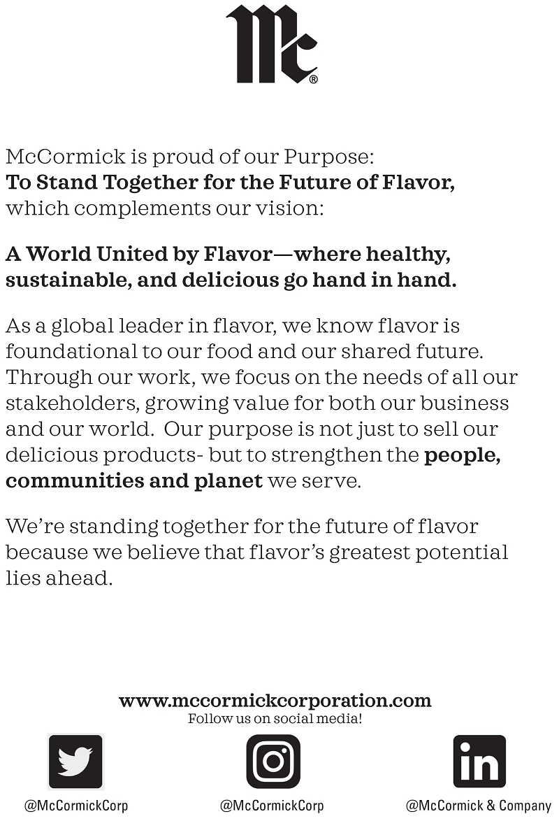 • Growth – McCormick is a global leader in flavor. Our broad and advantaged global flavor portfolio ideally positions us to fully meet the rising demand for flavor around the world. With the breadth and reach of our portfolio across segments, geographies, channels, customers and product offerings we are delivering flavor experiences for every meal occasion through our products and our customers’ products. The combination of the breadth and reach of our global flavor portfolio, our alignment with consumer trends, and our robust growth strategies provide a strong foundation for sustainable growth.