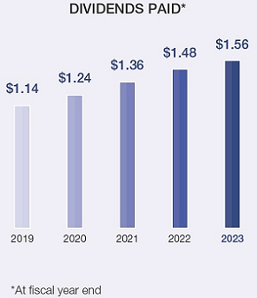 | 38 years of uninterrupted dividend increases | We have paid dividends every year since 1925 and have increased our dividend in each of the past 38 years, placing McCormick among the S&P 500’s Dividend Aristocrats. In 2023, our dividend paid reached $1.56 per share. At the end of 2023 our Board of Directors (the “Board” or the “Board of Directors”) authorized a 7.7% increase in the quarterly dividend continuing our long history of returning cash to stockholders. |