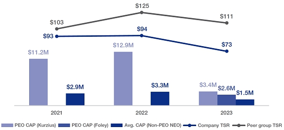 The PSUs that concluded their performance period at the end of fiscal 2023 were earned at 150% of target (or 50% of the maximum opportunity), reflecting strong three-year cumulative net sales, offset by a downward relative TSR modifier due to our stock price performance. Annual incentive payouts for 2023 to corporate Named Executive Officers (as defined below) performance were 138.2% of target, reflecting above target EPS and profit performance moderated by sales performance below target level.