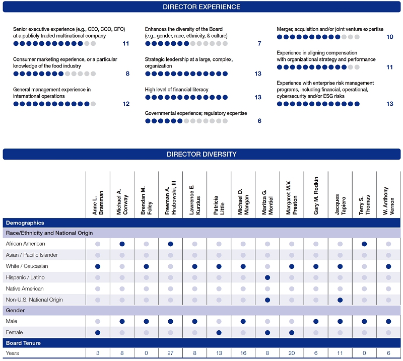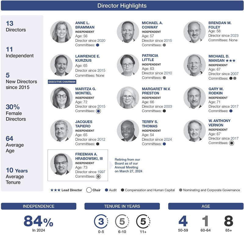 McCormick’s Board of Directors and leadership team continue to direct our strategy and set our course for growth. We are pleased to have Terry S. Thomas, the Chief Growth Officer for Flowers Foods, Inc., join McCormick’s Board in 2024 as a new independent director. Freeman A. Hrabowski, III will be retiring from our Board as of the Annual Meeting. Freeman has served as a director since 1997, and we sincerely appreciate his contributions and service.