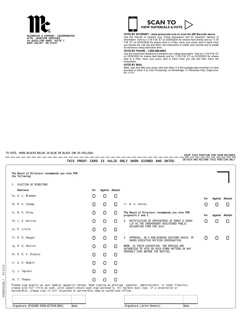 | 2. | the ratification of the appointment of Ernst & Young LLP as the independent registered public accounting firm of McCormick to serve for the 2024 fiscal year; |