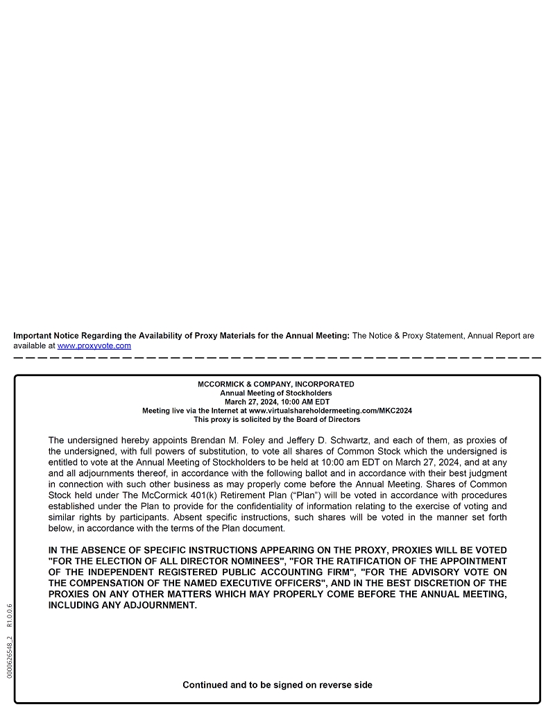 McCormick is furnishing proxy materials to its stockholders through the internet as permitted under the rules of the Securities and Exchange Commission. Under these rules, unless otherwise requested, each of McCormick’s stockholders will receive a Notice of Internet Availability of Proxy Materials instead of a paper copy of the Notice of 2024 Annual Meeting of Stockholders and Proxy Statement, our proxy card, and our Annual Report on Form 10-K. We believe this process gives us the opportunity to serve you more efficiently by making the proxy materials available quickly online and reducing costs associated with printing and postage.