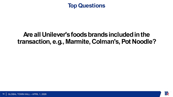 19 19 GLOBAL TOWN HALL – APRIL 1, 2026 19 Are all Unilever's foods brands included in the transaction, e.g., Marmite, Colman's, Pot Noodle? Top Questions