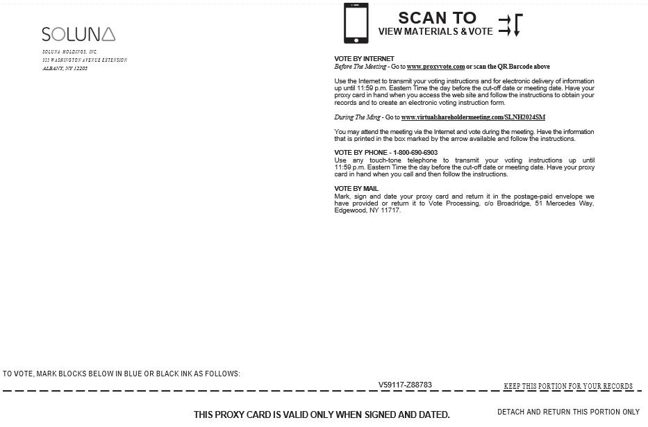 | ● | vote electronically at the Special Meeting by attending the live webcast at www.virtualshareholdermeeting.com/SLNH2024SM and follow the instructions on how to vote electronically; | |