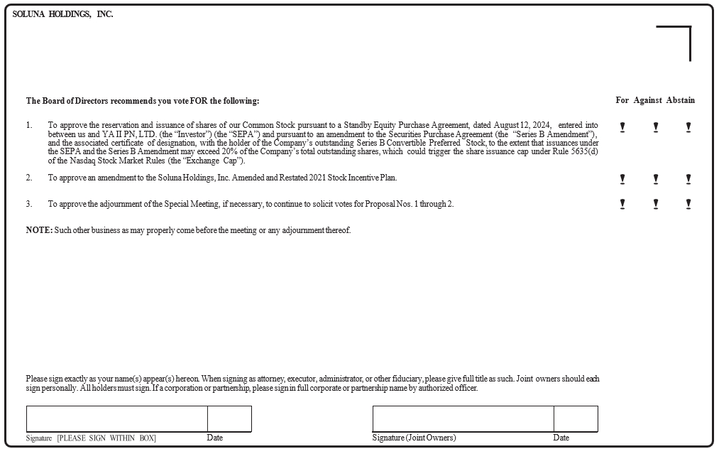 NOTICE IS HEREBY GIVEN that a special meeting of stockholders (the “Special Meeting”) of Soluna Holdings, Inc., a Nevada corporation (the “Company”), will be held on November 15, 2024, at 10:00 a.m., Eastern Time. The Special Meeting will be held completely virtually. You will be able to participate in the Special Meeting as well as vote and submit your questions and examine our stockholder list during the live webcast of the Special Meeting by visiting www.virtualshareholdermeeting.com/SLNH2024SM and entering the 16-digit control number included on your proxy card (the “Proxy Card”). At the Special Meeting, we will ask our stockholders to consider and act upon the following matters: