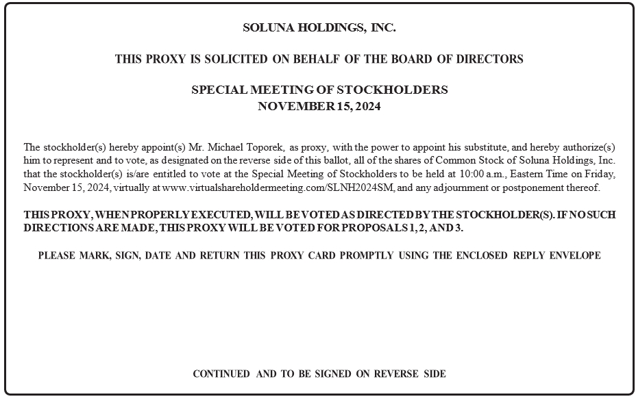 This proxy statement (this “Proxy Statement”) is furnished in connection with the solicitation of proxies by the Board of Directors (“Board”) of Soluna Holdings, Inc., a Nevada corporation (referred to in this Proxy Statement as the “Company,” “we,” “our” or “us”), to be voted at the special meeting of stockholders of the Company (the “Special Meeting”) to be held virtually on November 15, 2024 at 10:00 a.m., Eastern Time.