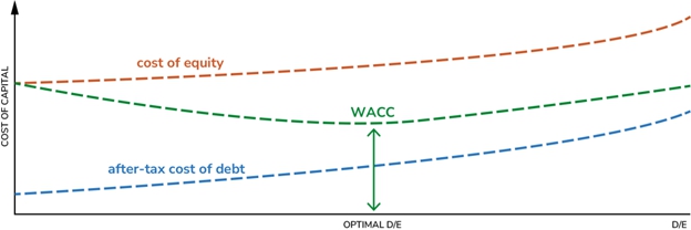 The chart below illustrates this relationship. WACC is highest at the extremes - that is, a capital mix of all equity or all debt. Optimal WACC results from a mix of the two, equity and debt.