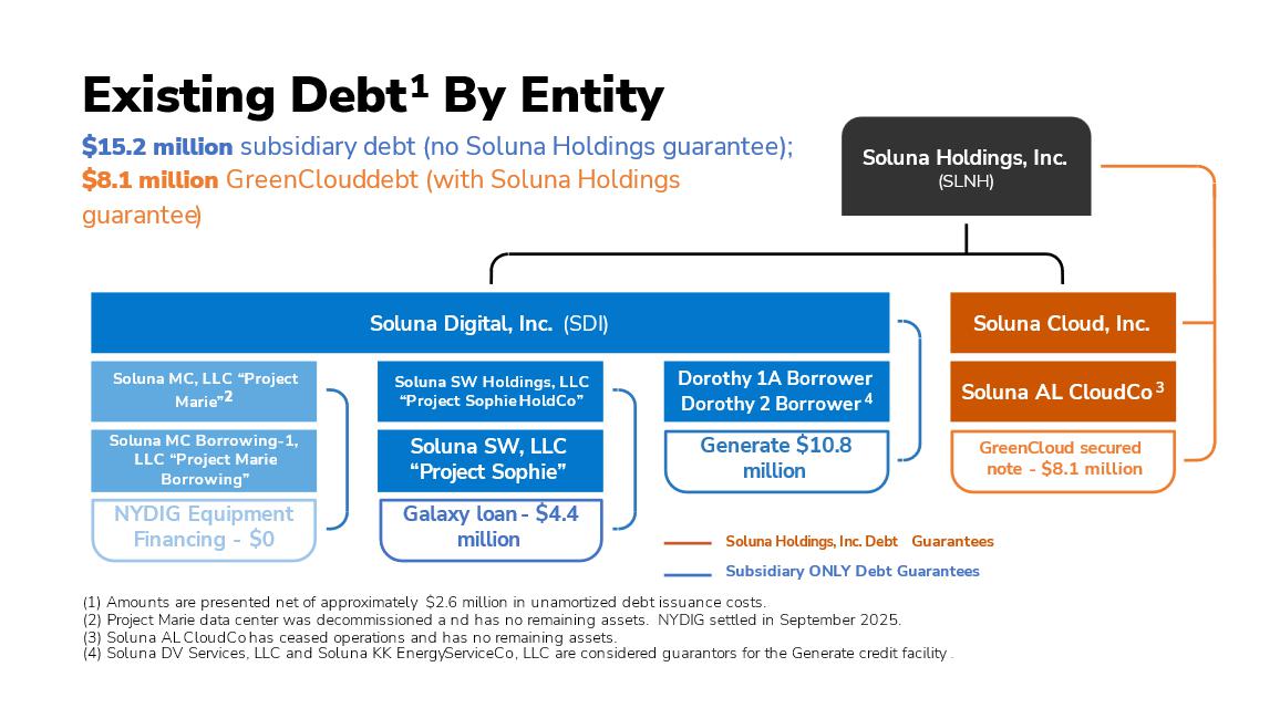 On January 14, 2022, the Company effected an initial drawdown under the Master Equipment Finance Agreement (“MEFA”) with NYDIG in the aggregate principal amount of approximately $4.6 million that bore interest at 14%. On January 26, 2022, the Company had a subsequent drawdown of $9.6 million. On December 20, 2022, Soluna MC Borrowing 2021-1 LLC (“Borrower”) received a Notice of Acceleration and Repossession (the “NYDIG Notice”) from NYDIG with respect to the MEFA, by and between Borrower, a subsidiary of Soluna MC, LLC, a subsidiary of Soluna Digital, a subsidiary of the Company, and NYDIG. The obligations of Borrower under the MEFA and reflected in the NYDIG Notice are ring-fenced to Borrower and its direct parent company, Soluna MC LLC. The Company is not a party to any guaranty, collateral agreement, or other support agreement with or for the benefit of NYDIG. As such, the principal balance of $10.5 million as of December 31, 2022 became due immediately and the Borrower shall bear interest, at a rate per annum equal to 2.0% plus the rate per annum otherwise applicable to such obligations set forth in the MEFA. On February 23, 2023, NYDIG proceeded to foreclose on all of the collateral securing the MEFA, and repossessed the collateralized assets that totaled approximately $3.4 million, in which approximately $560 thousand was first used to pay off accrued interest and penalty to date. On September 5, 2023, NYDIG provided a letter finalizing the accounting for the repossessed collateralized assets totaling proceeds of approximately $3.4 million. A summary judgment motion was performed on February 13, 2024 and was agreed upon by both NYDIG and the Borrower, that the total outstanding loan principal balance would be approximately $9.2 million, in which a penalty fee was applied of approximately $1.0 million to the repossessed collateralized assets, and outstanding interest and penalty balance was also applied (the “Agreed Judgment Amount”). On September 29, 2025, the Borrower and NYDIG entered into a Settlement Agreement (the “Settlement Agreement”), pursuant to which the Borrower and NYDIG agreed to fully settle and resolve the Agreed Judgment Amount and all other matters relating to the NYDIG loans in exchange for the Borrower’s agreement to make certain settlement payments to NYDIG in accordance with the Settlement Agreement. In exchange for such settlement payments, NYDIG, on behalf of itself and its related parties, and its and their respective predecessors, successors, heirs and assigns, agreed to release the Borrower and their affiliates from any and all claims, demands, actions, causes of action, liabilities, damages, costs, and expenses, whether known or unknown, arising out of or relating to the Agreed Judgment Amount and the NYDIG loans (other than obligations under the Settlement Agreement). The Company has recorded a gain on extinguishment of debt for the outstanding principal and accrued interest and penalties. As of September 30, 2025, the Borrower has paid a portion of the Settlement Agreement amount, and the remaining settlement obligation is included in “Accrued Expenses”. Subsequently, the remaining Settlement Agreement amount has been fully paid and satisfied.