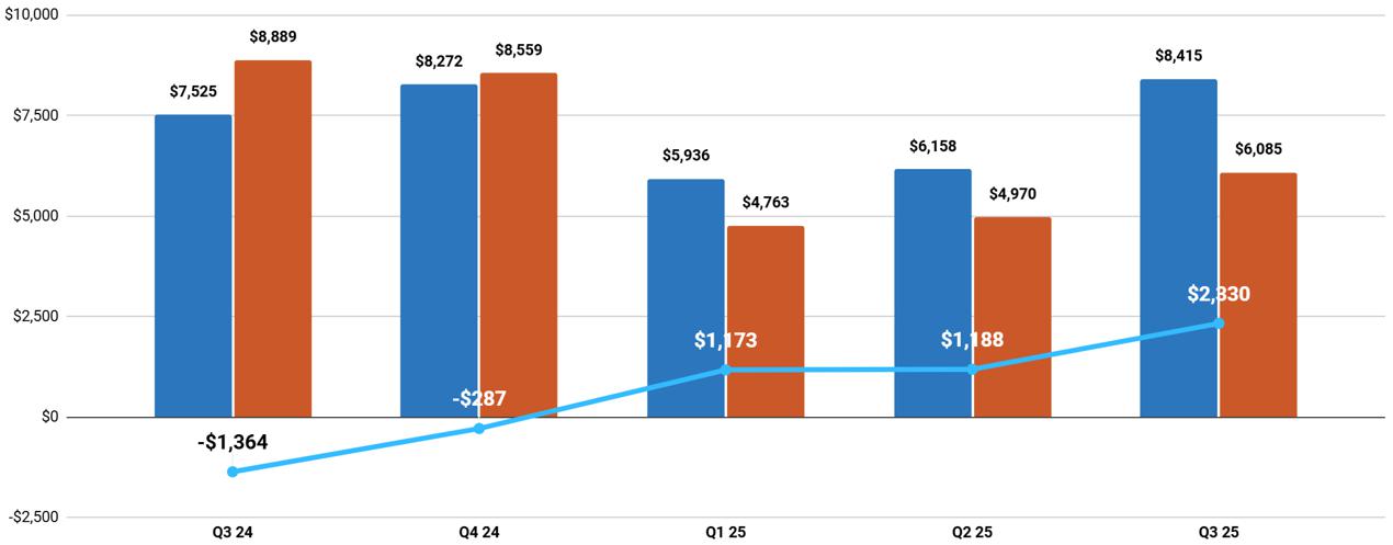 | ○ | Dorothy 2 commenced customer deployments in Q2, with labor costs ramping ahead of revenue, consistent with planned early-stage operations. Q3 saw a major increase in revenue (+$2M) from Q2. |