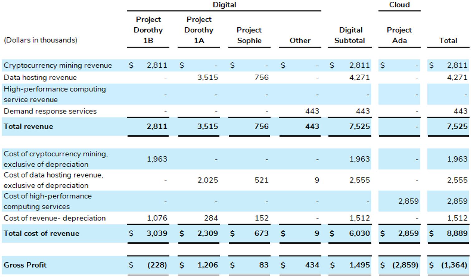 The following table summarizes the balances for the project sites for cryptocurrency mining revenue, data hosting revenue, high-performance computing service revenue, demand response revenue, cost of cryptocurrency mining revenue, exclusive of depreciation, cost of data hosting revenue, exclusive of depreciation, cost of high-performance computing services, and cost of depreciation during the nine months ended September 30, 2025: