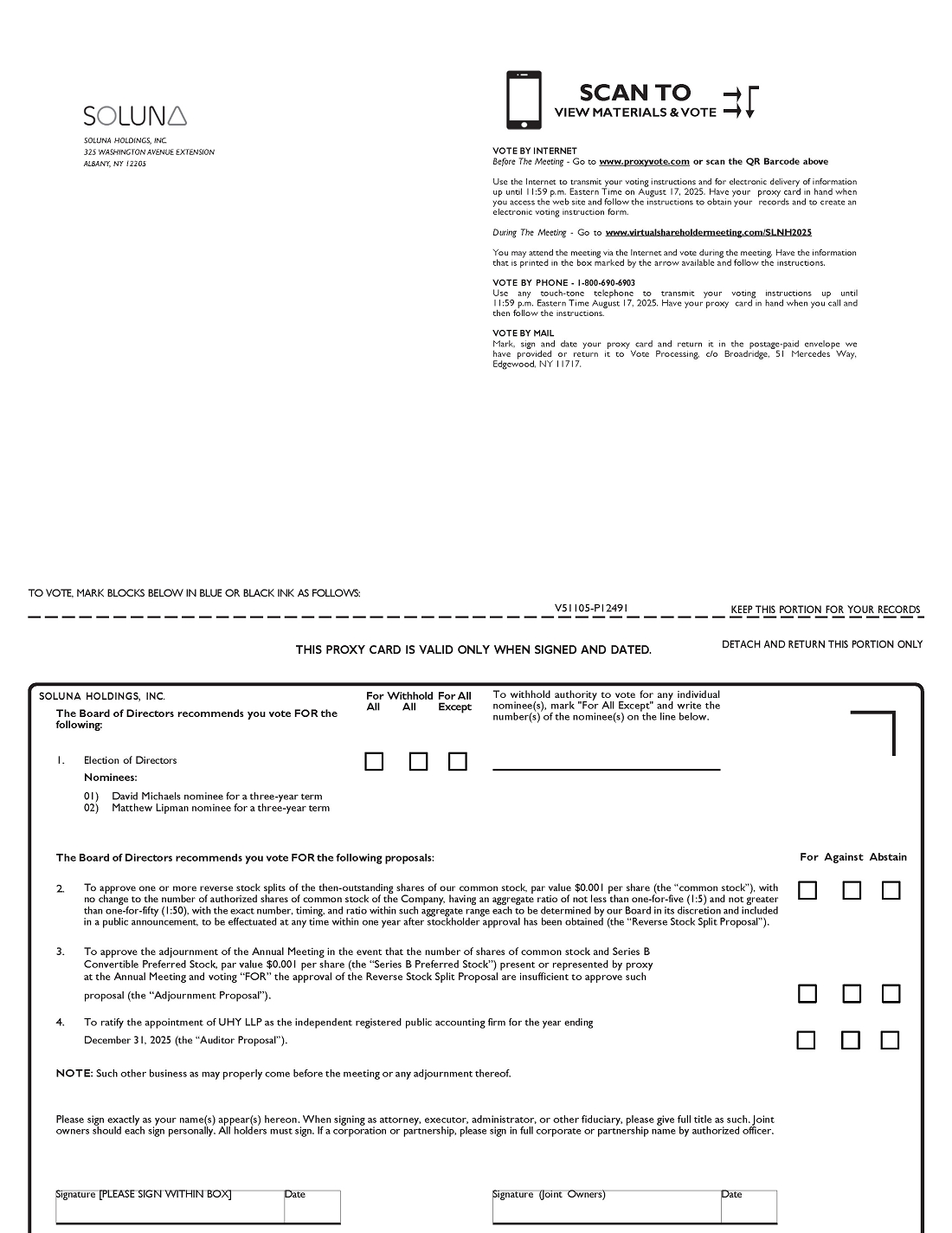 An online portal will be available to our stockholders at www.proxyvote.com commencing approximately on or about July 16, 2025. By accessing this portal, stockholders will be able to submit a proxy to vote in advance of the Annual Meeting. Stockholders may also vote, and submit questions, during the Annual Meeting at www.virtualshareholdermeeting.com/SLNH2025. To demonstrate proof of stock ownership, you will need to enter the 16-digit control number received with your proxy card to submit questions and vote at our Annual Meeting. If you hold your shares in “street name” (that is, through a broker or other nominee), you will need authorization from your broker or nominee in order to vote. We intend to answer questions submitted during the Annual Meeting that are pertinent to the Company and the items being brought for stockholder vote at the Annual Meeting, as time permits, and in accordance with the Rules of Conduct for the Annual Meeting. We have retained Broadridge Financial Solutions to host our virtual Annual Meeting and to distribute proxies and receive, count and tabulate votes.