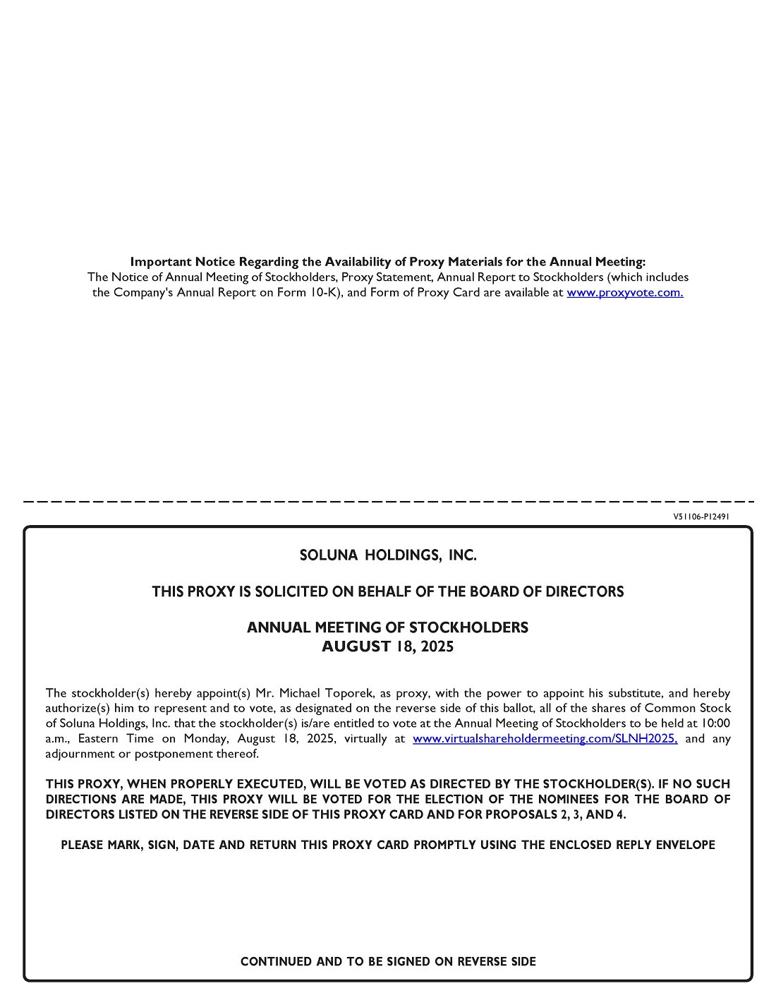 To ensure that your shares are represented at the Annual Meeting, please either (a) vote over the Internet following the instructions provided in this Proxy Statement, (b) vote by telephone by calling Broadridge Financial Solutions at 1-800-690-6903 or (c) complete, sign, date and promptly return the proxy card to Soluna Holdings, Inc.