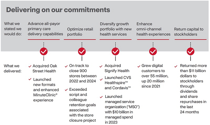 We made significant progress on our health care delivery strategy in 2023. We broadened our value-based care capabilities into the home and into primary care with the acquisitions of Signify Health, Inc. and Oak Street Health, Inc., respectively. We quickly advanced our commitment to offer services and care to more patients, customers and members across CVS Health. We developed new clinic formats that are expected to remove barriers to care for communities with the greatest needs. By enabling more connections across CVS Health’s care offerings, we believe we can improve the way a consumer or patient engages in their overall health.