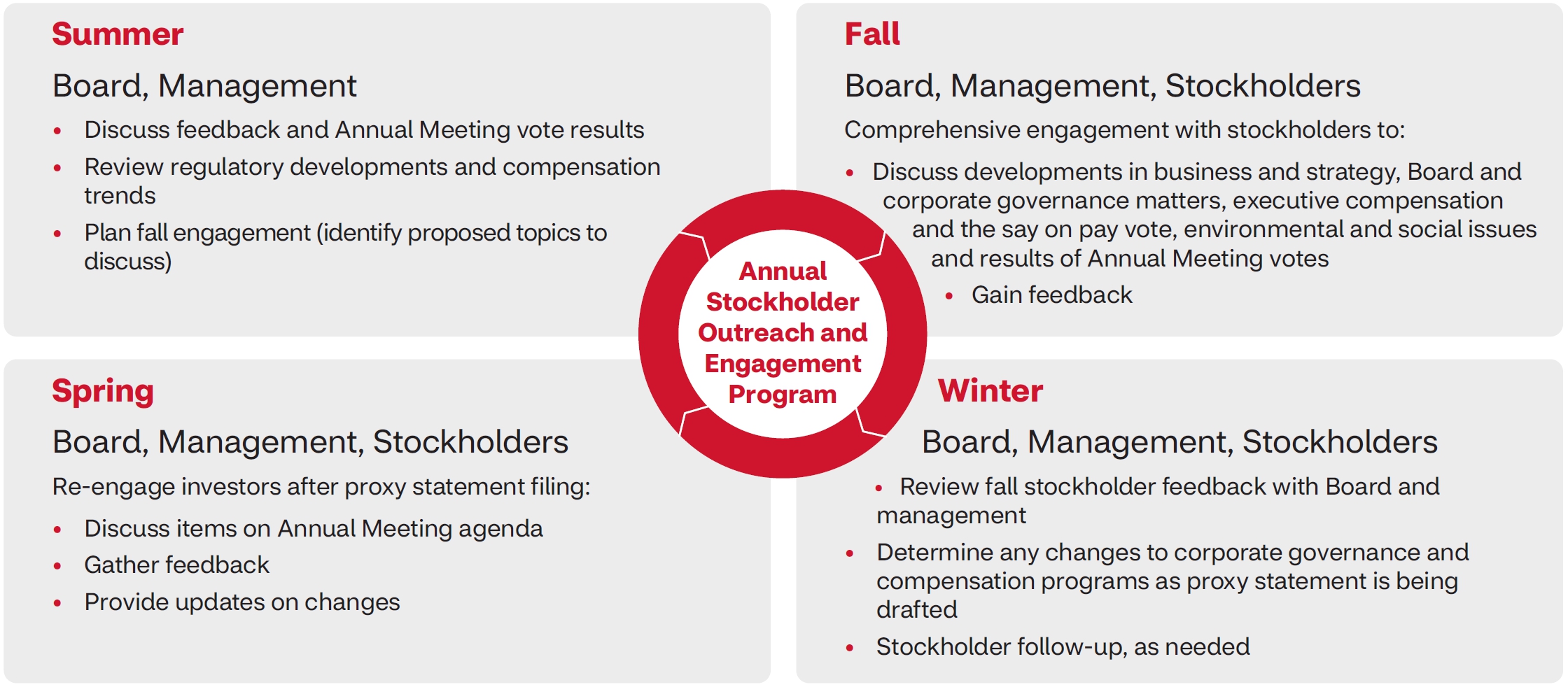 Over the course of the year, our management team and our Board of Directors work closely together on the advancement of the Company’s strategic plan. This year was no exception. We connected with stockholders throughout the year to hear directly from them and better understand their priorities and concerns, including those related to executive compensation. As we describe within this proxy statement, we believe in aligning executive compensation with performance. We will continue to be responsive as we enhance our understanding of your perspectives.