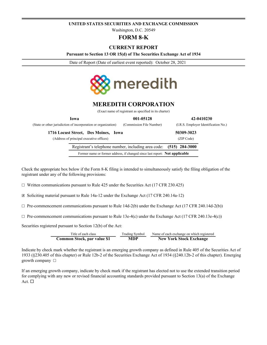 UNITED STATES SECURITIES AND EXCHANGE COMMISSION Washington, D.C. 20549 FORM 8-K CURRENT REPORT Pursuant to Section 13 OR 15(d) of The Securities Exchange Act of 1934 Date of Report (Date of earliest event reported): October 28, 2021 MEREDITH CORPORATION (Exact name of registrant as specified in its charter) Iowa 001-05128 42-0410230 (State or other jurisdiction of incorporation or organization) (Commission File Number) (I.R.S. Employer Identification No.) 1716 Locust Street, Des Moines, Iowa 50309-3023 (Address of principal executive offices) (ZIP Code) Registrant’s telephone number, including area code: (515) 284-3000 Former name or former address, if changed since last report: Not applicable Check the appropriate box below if the Form 8-K filing is intended to simultaneously satisfy the filing obligation of the registrant under any of the following provisions: ☐ Written communications pursuant to Rule 425 under the Securities Act (17 CFR 230.425) ☒ Soliciting material pursuant to Rule 14a-12 under the Exchange Act (17 CFR 240.14a-12) ☐ Pre-commencement communications pursuant to Rule 14d-2(b) under the Exchange Act (17 CFR 240.14d-2(b)) ☐ Pre-commencement communications pursuant to Rule 13e-4(c) under the Exchange Act (17 CFR 240.13e-4(c)) Securities registered pursuant to Section 12(b) of the Act: Title of each class Trading Symbol Name of each exchange on which registered Common Stock, par value $1 MDP New York Stock Exchange Indicate by check mark whether the registrant is an emerging growth company as defined in Rule 405 of the Securities Act of 1933 (§230.405 of this chapter) or Rule 12b-2 of the Securities Exchange Act of 1934 (§240.12b-2 of this chapter). Emerging growth company ☐ If an emerging growth company, indicate by check mark if the registrant has elected not to use the extended transition period for complying with any new or revised financial accounting standards provided pursuant to Section 13(a) of the Exchange Act. ¨