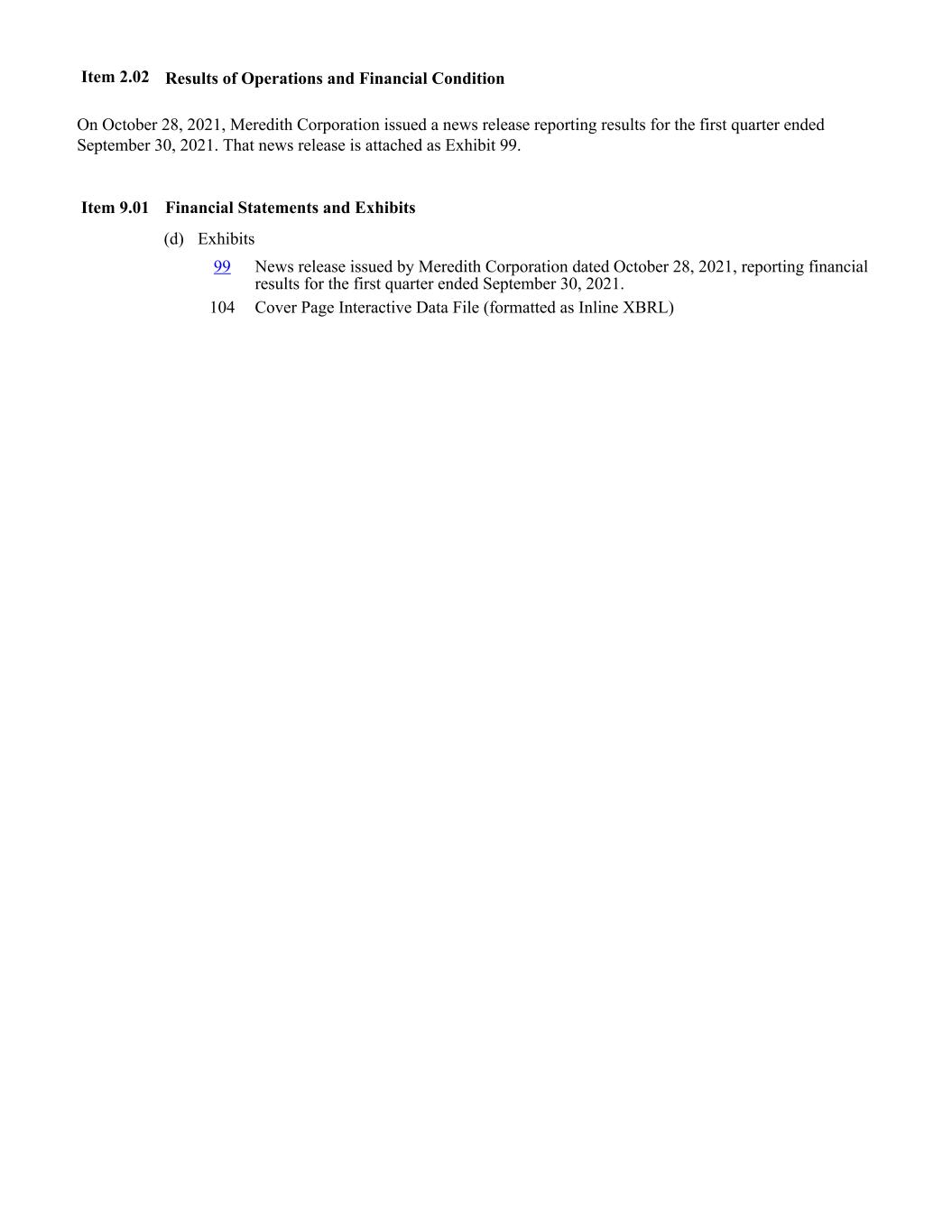Item 2.02 Results of Operations and Financial Condition On October 28, 2021, Meredith Corporation issued a news release reporting results for the first quarter ended September 30, 2021. That news release is attached as Exhibit 99. Item 9.01 Financial Statements and Exhibits (d) Exhibits 99 News release issued by Meredith Corporation dated October 28, 2021, reporting financial results for the first quarter ended September 30, 2021. 104 Cover Page Interactive Data File (formatted as Inline XBRL)
