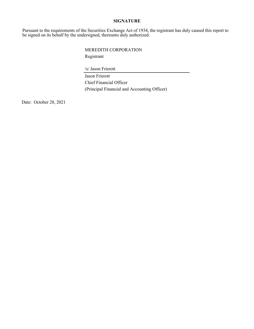 SIGNATURE Pursuant to the requirements of the Securities Exchange Act of 1934, the registrant has duly caused this report to be signed on its behalf by the undersigned, thereunto duly authorized. MEREDITH CORPORATION Registrant /s/ Jason Frierott Jason Frierott Chief Financial Officer (Principal Financial and Accounting Officer) Date: October 28, 2021