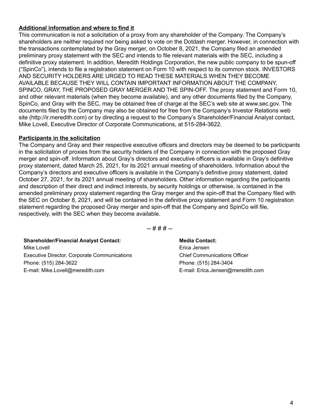 Additional information and where to find it This communication is not a solicitation of a proxy from any shareholder of the Company. The Company’s shareholders are neither required nor being asked to vote on the Dotdash merger. However, in connection with the transactions contemplated by the Gray merger, on October 8, 2021, the Company filed an amended preliminary proxy statement with the SEC and intends to file relevant materials with the SEC, including a definitive proxy statement. In addition, Meredith Holdings Corporation, the new public company to be spun-off (“SpinCo”), intends to file a registration statement on Form 10 with respect to its common stock. INVESTORS AND SECURITY HOLDERS ARE URGED TO READ THESE MATERIALS WHEN THEY BECOME AVAILABLE BECAUSE THEY WILL CONTAIN IMPORTANT INFORMATION ABOUT THE COMPANY, SPINCO, GRAY, THE PROPOSED GRAY MERGER AND THE SPIN-OFF. The proxy statement and Form 10, and other relevant materials (when they become available), and any other documents filed by the Company, SpinCo, and Gray with the SEC, may be obtained free of charge at the SEC’s web site at www.sec.gov. The documents filed by the Company may also be obtained for free from the Company’s Investor Relations web site (http://ir.meredith.com) or by directing a request to the Company’s Shareholder/Financial Analyst contact, Mike Lovell, Executive Director of Corporate Communications, at 515-284-3622. Participants in the solicitation The Company and Gray and their respective executive officers and directors may be deemed to be participants in the solicitation of proxies from the security holders of the Company in connection with the proposed Gray merger and spin-off. Information about Gray’s directors and executive officers is available in Gray’s definitive proxy statement, dated March 25, 2021, for its 2021 annual meeting of shareholders. Information about the Company’s directors and executive officers is available in the Company’s definitive proxy statement, dated October 27, 2021, for its 2021 annual meeting of shareholders. Other information regarding the participants and description of their direct and indirect interests, by security holdings or otherwise, is contained in the amended preliminary proxy statement regarding the Gray merger and the spin-off that the Company filed with the SEC on October 8, 2021, and will be contained in the definitive proxy statement and Form 10 registration statement regarding the proposed Gray merger and spin-off that the Company and SpinCo will file, respectively, with the SEC when they become available. -- # # # -- Shareholder/Financial Analyst Contact: Media Contact: Mike Lovell Erica Jensen Executive Director, Corporate Communications Chief Communications Officer Phone: (515) 284-3622 Phone: (515) 284-3404 E-mail: Mike.Lovell@meredith.com E-mail: Erica.Jensen@meredith.com 4