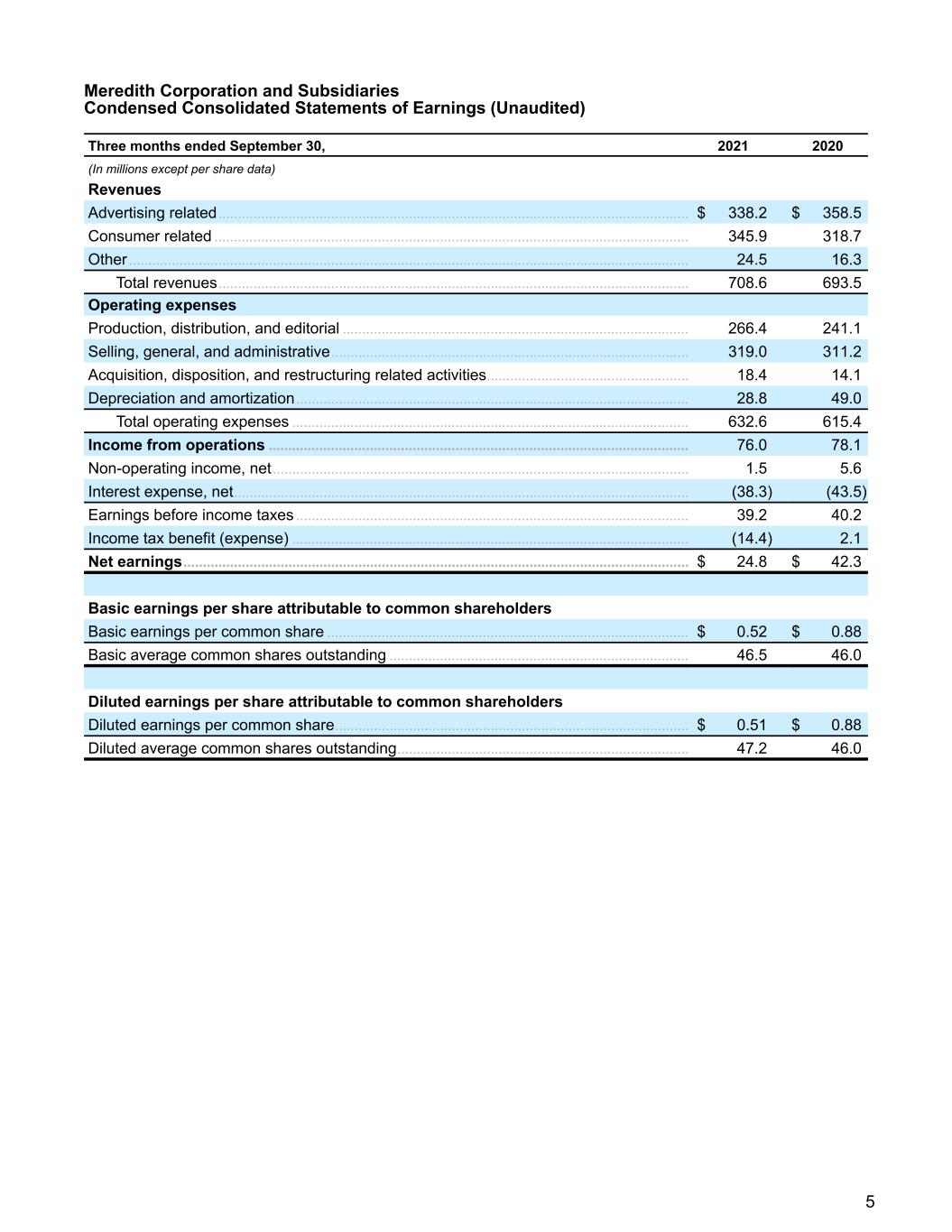 Meredith Corporation and Subsidiaries Condensed Consolidated Statements of Earnings (Unaudited) Three months ended September 30, 2021 2020 (In millions except per share data) Revenues Advertising related ......................................................................................................................... $ 338.2 $ 358.5 Consumer related .......................................................................................................................... 345.9 318.7 Other ................................................................................................................................................ 24.5 16.3 Total revenues ......................................................................................................................... 708.6 693.5 Operating expenses Production, distribution, and editorial ......................................................................................... 266.4 241.1 Selling, general, and administrative ............................................................................................ 319.0 311.2 Acquisition, disposition, and restructuring related activities .................................................... 18.4 14.1 Depreciation and amortization ..................................................................................................... 28.8 49.0 Total operating expenses ...................................................................................................... 632.6 615.4 Income from operations ............................................................................................................ 76.0 78.1 Non-operating income, net ........................................................................................................... 1.5 5.6 Interest expense, net ..................................................................................................................... (38.3) (43.5) Earnings before income taxes ..................................................................................................... 39.2 40.2 Income tax benefit (expense) ...................................................................................................... (14.4) 2.1 Net earnings .................................................................................................................................. $ 24.8 $ 42.3 Basic earnings per share attributable to common shareholders Basic earnings per common share ............................................................................................. $ 0.52 $ 0.88 Basic average common shares outstanding ............................................................................. 46.5 46.0 Diluted earnings per share attributable to common shareholders Diluted earnings per common share ........................................................................................... $ 0.51 $ 0.88 Diluted average common shares outstanding ........................................................................... 47.2 46.0 5