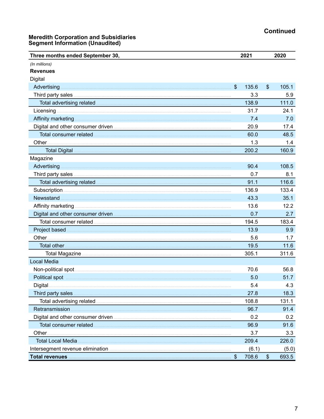 Continued Meredith Corporation and Subsidiaries Segment Information (Unaudited) Three months ended September 30, 2021 2020 (In millions) Revenues Digital Advertising ................................................................................................................................. $ 135.6 $ 105.1 Third party sales ....................................................................................................................... 3.3 5.9 Total advertising related ...................................................................................................... 138.9 111.0 Licensing .................................................................................................................................... 31.7 24.1 Affinity marketing ...................................................................................................................... 7.4 7.0 Digital and other consumer driven ......................................................................................... 20.9 17.4 Total consumer related ........................................................................................................ 60.0 48.5 Other ........................................................................................................................................... 1.3 1.4 Total Digital ....................................................................................................................... 200.2 160.9 Magazine Advertising ................................................................................................................................. 90.4 108.5 Third party sales ....................................................................................................................... 0.7 8.1 Total advertising related ...................................................................................................... 91.1 116.6 Subscription ............................................................................................................................... 136.9 133.4 Newsstand ................................................................................................................................. 43.3 35.1 Affinity marketing ...................................................................................................................... 13.6 12.2 Digital and other consumer driven ......................................................................................... 0.7 2.7 Total consumer related ........................................................................................................ 194.5 183.4 Project based ............................................................................................................................ 13.9 9.9 Other ........................................................................................................................................... 5.6 1.7 Total other .............................................................................................................................. 19.5 11.6 Total Magazine ................................................................................................................. 305.1 311.6 Local Media Non-political spot ...................................................................................................................... 70.6 56.8 Political spot ............................................................................................................................. 5.0 51.7 Digital .......................................................................................................................................... 5.4 4.3 Third party sales ....................................................................................................................... 27.8 18.3 Total advertising related ...................................................................................................... 108.8 131.1 Retransmission ......................................................................................................................... 96.7 91.4 Digital and other consumer driven ......................................................................................... 0.2 0.2 Total consumer related ........................................................................................................ 96.9 91.6 Other ........................................................................................................................................... 3.7 3.3 Total Local Media .................................................................................................................... 209.4 226.0 Intersegment revenue elimination ............................................................................................ (6.1) (5.0) Total revenues ........................................................................................................................... $ 708.6 $ 693.5 7
