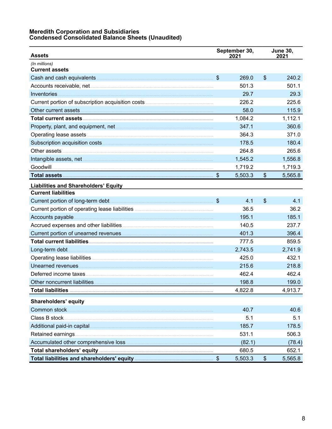 Meredith Corporation and Subsidiaries Condensed Consolidated Balance Sheets (Unaudited) Assets September 30, 2021 June 30, 2021 (In millions) Current assets Cash and cash equivalents ...................................................................................... $ 269.0 $ 240.2 Accounts receivable, net ........................................................................................... 501.3 501.1 Inventories ................................................................................................................... 29.7 29.3 Current portion of subscription acquisition costs .................................................. 226.2 225.6 Other current assets .................................................................................................. 58.0 115.9 Total current assets ................................................................................................ 1,084.2 1,112.1 Property, plant, and equipment, net ........................................................................ 347.1 360.6 Operating lease assets ............................................................................................. 364.3 371.0 Subscription acquisition costs .................................................................................. 178.5 180.4 Other assets ................................................................................................................ 264.8 265.6 Intangible assets, net ................................................................................................ 1,545.2 1,556.8 Goodwill ....................................................................................................................... 1,719.2 1,719.3 Total assets ............................................................................................................... $ 5,503.3 $ 5,565.8 Liabilities and Shareholders’ Equity Current liabilities Current portion of long-term debt ............................................................................ $ 4.1 $ 4.1 Current portion of operating lease liabilities .......................................................... 36.5 36.2 Accounts payable ....................................................................................................... 195.1 185.1 Accrued expenses and other liabilities ................................................................... 140.5 237.7 Current portion of unearned revenues .................................................................... 401.3 396.4 Total current liabilities ............................................................................................ 777.5 859.5 Long-term debt ........................................................................................................... 2,743.5 2,741.9 Operating lease liabilities .......................................................................................... 425.0 432.1 Unearned revenues ................................................................................................... 215.6 218.8 Deferred income taxes .............................................................................................. 462.4 462.4 Other noncurrent liabilities ........................................................................................ 198.8 199.0 Total liabilities .......................................................................................................... 4,822.8 4,913.7 Shareholders’ equity Common stock ............................................................................................................ 40.7 40.6 Class B stock .............................................................................................................. 5.1 5.1 Additional paid-in capital ........................................................................................... 185.7 178.5 Retained earnings ...................................................................................................... 531.1 506.3 Accumulated other comprehensive loss ................................................................ (82.1) (78.4) Total shareholders’ equity .................................................................................... 680.5 652.1 Total liabilities and shareholders' equity .......................................................... $ 5,503.3 $ 5,565.8 8