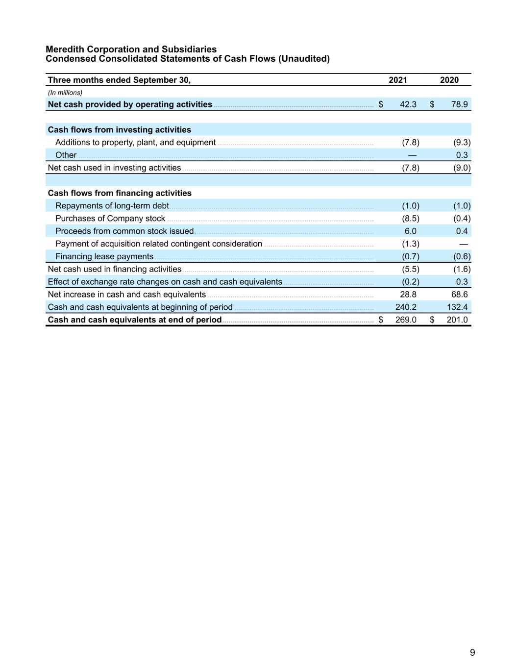 Meredith Corporation and Subsidiaries Condensed Consolidated Statements of Cash Flows (Unaudited) Three months ended September 30, 2021 2020 (In millions) Net cash provided by operating activities ............................................................................ $ 42.3 $ 78.9 Cash flows from investing activities Additions to property, plant, and equipment .......................................................................... (7.8) (9.3) Other ............................................................................................................................................ — 0.3 Net cash used in investing activities ........................................................................................... (7.8) (9.0) Cash flows from financing activities Repayments of long-term debt ................................................................................................. (1.0) (1.0) Purchases of Company stock .................................................................................................. (8.5) (0.4) Proceeds from common stock issued ..................................................................................... 6.0 0.4 Payment of acquisition related contingent consideration .................................................... (1.3) — Financing lease payments ........................................................................................................ (0.7) (0.6) Net cash used in financing activities ........................................................................................... (5.5) (1.6) Effect of exchange rate changes on cash and cash equivalents ........................................... (0.2) 0.3 Net increase in cash and cash equivalents ............................................................................... 28.8 68.6 Cash and cash equivalents at beginning of period .................................................................. 240.2 132.4 Cash and cash equivalents at end of period ........................................................................ $ 269.0 $ 201.0 9