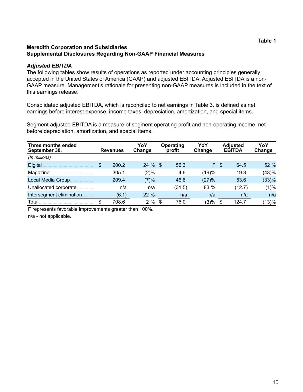 Table 1 Meredith Corporation and Subsidiaries Supplemental Disclosures Regarding Non-GAAP Financial Measures Adjusted EBITDA The following tables show results of operations as reported under accounting principles generally accepted in the United States of America (GAAP) and adjusted EBITDA. Adjusted EBITDA is a non- GAAP measure. Management’s rationale for presenting non-GAAP measures is included in the text of this earnings release. Consolidated adjusted EBITDA, which is reconciled to net earnings in Table 3, is defined as net earnings before interest expense, income taxes, depreciation, amortization, and special items. Segment adjusted EBITDA is a measure of segment operating profit and non-operating income, net before depreciation, amortization, and special items. Three months ended September 30, Revenues YoY Change Operating profit YoY Change Adjusted EBITDA YoY Change (In millions) Digital ......................................... $ 200.2 24 % $ 56.3 F $ 64.5 52 % Magazine ................................... 305.1 (2) % 4.6 (19) % 19.3 (43) % Local Media Group ................... 209.4 (7) % 46.6 (27) % 53.6 (33) % Unallocated corporate ............. n/a n/a (31.5) 83 % (12.7) (1) % Intersegment elimination ......... (6.1) 22 % n/a n/a n/a n/a Total ............................................ $ 708.6 2 % $ 76.0 (3) % $ 124.7 (13) % F represents favorable improvements greater than 100%. n/a - not applicable. 10