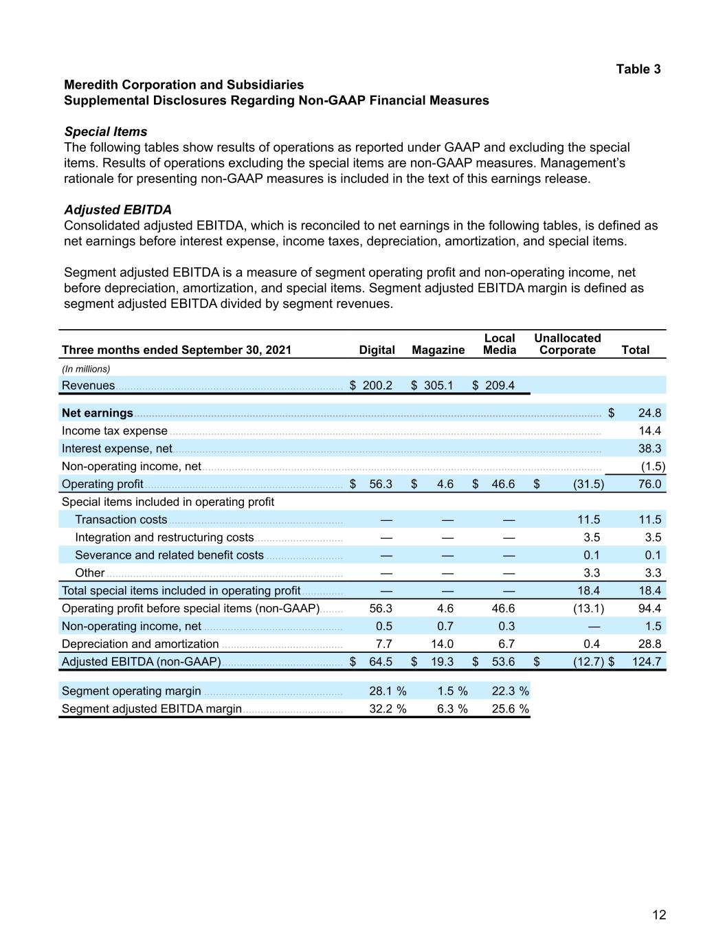 Table 3 Meredith Corporation and Subsidiaries Supplemental Disclosures Regarding Non-GAAP Financial Measures Special Items The following tables show results of operations as reported under GAAP and excluding the special items. Results of operations excluding the special items are non-GAAP measures. Management’s rationale for presenting non-GAAP measures is included in the text of this earnings release. Adjusted EBITDA Consolidated adjusted EBITDA, which is reconciled to net earnings in the following tables, is defined as net earnings before interest expense, income taxes, depreciation, amortization, and special items. Segment adjusted EBITDA is a measure of segment operating profit and non-operating income, net before depreciation, amortization, and special items. Segment adjusted EBITDA margin is defined as segment adjusted EBITDA divided by segment revenues. Three months ended September 30, 2021 Digital Magazine Local Media Unallocated Corporate Total (In millions) Revenues ............................................................................. $ 200.2 $ 305.1 $ 209.4 Net earnings .............................................................................................................................................................. $ 24.8 Income tax expense .................................................................................................................................................. 14.4 Interest expense, net ................................................................................................................................................. 38.3 Non-operating income, net ....................................................................................................................................... (1.5) Operating profit ................................................................... $ 56.3 $ 4.6 $ 46.6 $ (31.5) 76.0 Special items included in operating profit Transaction costs ........................................................... — — — 11.5 11.5 Integration and restructuring costs .............................. — — — 3.5 3.5 Severance and related benefit costs .......................... — — — 0.1 0.1 Other ................................................................................ — — — 3.3 3.3 Total special items included in operating profit .............. — — — 18.4 18.4 Operating profit before special items (non-GAAP) ........ 56.3 4.6 46.6 (13.1) 94.4 Non-operating income, net ............................................... 0.5 0.7 0.3 — 1.5 Depreciation and amortization ......................................... 7.7 14.0 6.7 0.4 28.8 Adjusted EBITDA (non-GAAP) ......................................... $ 64.5 $ 19.3 $ 53.6 $ (12.7) $ 124.7 Segment operating margin ............................................... 28.1 % 1.5 % 22.3 % Segment adjusted EBITDA margin .................................. 32.2 % 6.3 % 25.6 % 12