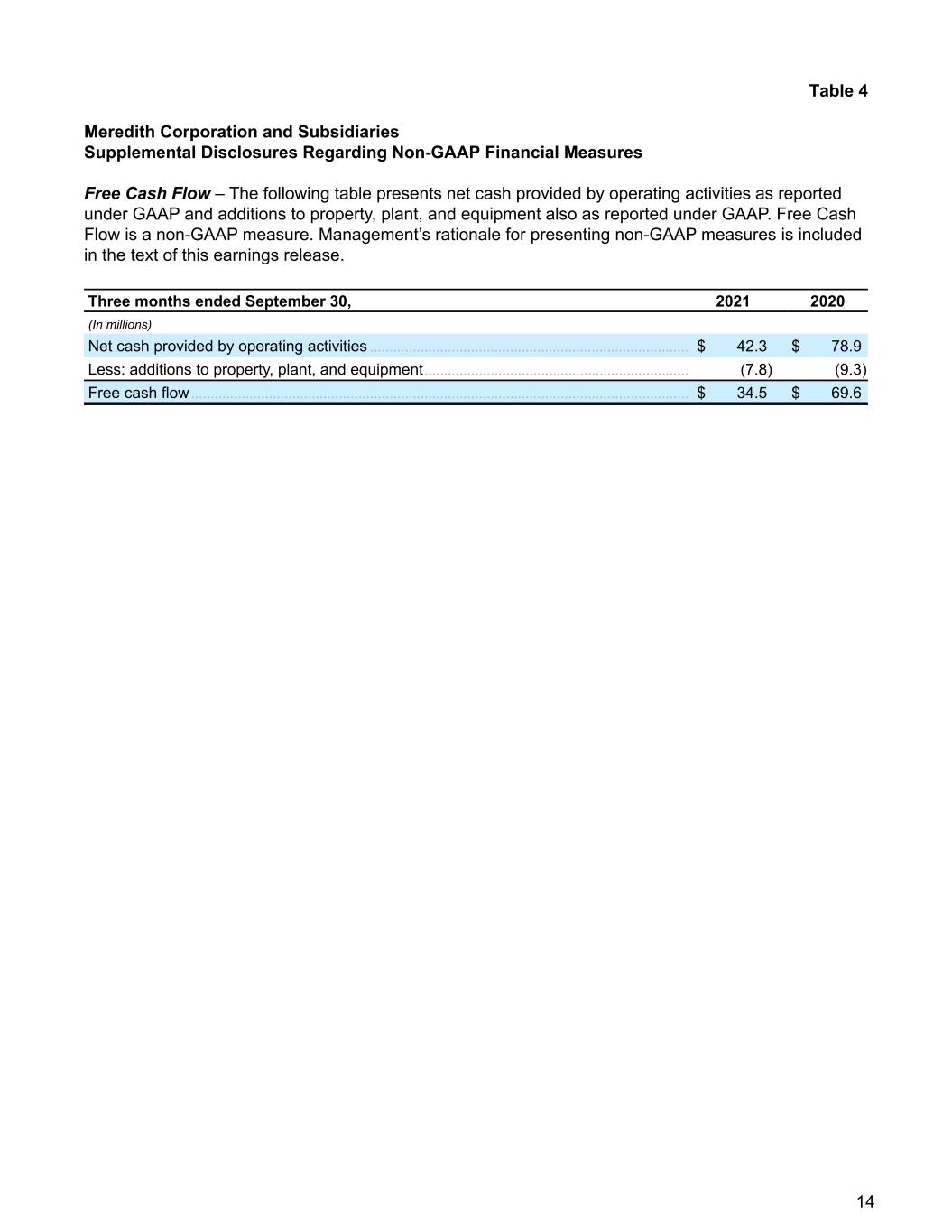 Table 4 Meredith Corporation and Subsidiaries Supplemental Disclosures Regarding Non-GAAP Financial Measures Free Cash Flow – The following table presents net cash provided by operating activities as reported under GAAP and additions to property, plant, and equipment also as reported under GAAP. Free Cash Flow is a non-GAAP measure. Management’s rationale for presenting non-GAAP measures is included in the text of this earnings release. Three months ended September 30, 2021 2020 (In millions) Net cash provided by operating activities .................................................................................. $ 42.3 $ 78.9 Less: additions to property, plant, and equipment .................................................................... (7.8) (9.3) Free cash flow ................................................................................................................................ $ 34.5 $ 69.6 14