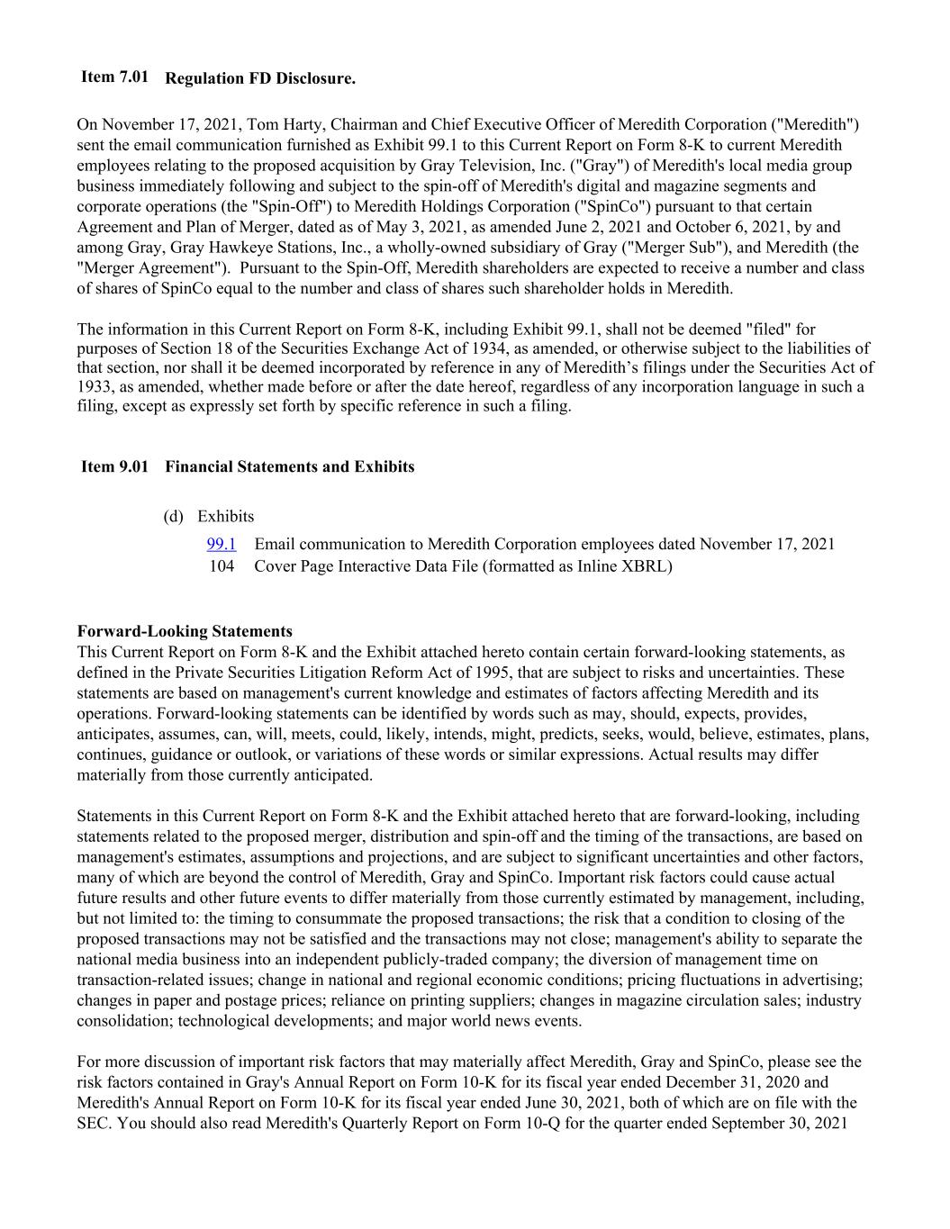 Item 7.01 Regulation FD Disclosure. On November 17, 2021, Tom Harty, Chairman and Chief Executive Officer of Meredith Corporation ("Meredith") sent the email communication furnished as Exhibit 99.1 to this Current Report on Form 8-K to current Meredith employees relating to the proposed acquisition by Gray Television, Inc. ("Gray") of Meredith's local media group business immediately following and subject to the spin-off of Meredith's digital and magazine segments and corporate operations (the "Spin-Off") to Meredith Holdings Corporation ("SpinCo") pursuant to that certain Agreement and Plan of Merger, dated as of May 3, 2021, as amended June 2, 2021 and October 6, 2021, by and among Gray, Gray Hawkeye Stations, Inc., a wholly-owned subsidiary of Gray ("Merger Sub"), and Meredith (the "Merger Agreement"). Pursuant to the Spin-Off, Meredith shareholders are expected to receive a number and class of shares of SpinCo equal to the number and class of shares such shareholder holds in Meredith. The information in this Current Report on Form 8-K, including Exhibit 99.1, shall not be deemed "filed" for purposes of Section 18 of the Securities Exchange Act of 1934, as amended, or otherwise subject to the liabilities of that section, nor shall it be deemed incorporated by reference in any of Meredith’s filings under the Securities Act of 1933, as amended, whether made before or after the date hereof, regardless of any incorporation language in such a filing, except as expressly set forth by specific reference in such a filing. Item 9.01 Financial Statements and Exhibits (d) Exhibits 99.1 Email communication to Meredith Corporation employees dated November 17, 2021 104 Cover Page Interactive Data File (formatted as Inline XBRL) Forward-Looking Statements This Current Report on Form 8-K and the Exhibit attached hereto contain certain forward-looking statements, as defined in the Private Securities Litigation Reform Act of 1995, that are subject to risks and uncertainties. These statements are based on management's current knowledge and estimates of factors affecting Meredith and its operations. Forward-looking statements can be identified by words such as may, should, expects, provides, anticipates, assumes, can, will, meets, could, likely, intends, might, predicts, seeks, would, believe, estimates, plans, continues, guidance or outlook, or variations of these words or similar expressions. Actual results may differ materially from those currently anticipated. Statements in this Current Report on Form 8-K and the Exhibit attached hereto that are forward-looking, including statements related to the proposed merger, distribution and spin-off and the timing of the transactions, are based on management's estimates, assumptions and projections, and are subject to significant uncertainties and other factors, many of which are beyond the control of Meredith, Gray and SpinCo. Important risk factors could cause actual future results and other future events to differ materially from those currently estimated by management, including, but not limited to: the timing to consummate the proposed transactions; the risk that a condition to closing of the proposed transactions may not be satisfied and the transactions may not close; management's ability to separate the national media business into an independent publicly-traded company; the diversion of management time on transaction-related issues; change in national and regional economic conditions; pricing fluctuations in advertising; changes in paper and postage prices; reliance on printing suppliers; changes in magazine circulation sales; industry consolidation; technological developments; and major world news events. For more discussion of important risk factors that may materially affect Meredith, Gray and SpinCo, please see the risk factors contained in Gray's Annual Report on Form 10-K for its fiscal year ended December 31, 2020 and Meredith's Annual Report on Form 10-K for its fiscal year ended June 30, 2021, both of which are on file with the SEC. You should also read Meredith's Quarterly Report on Form 10-Q for the quarter ended September 30, 2021