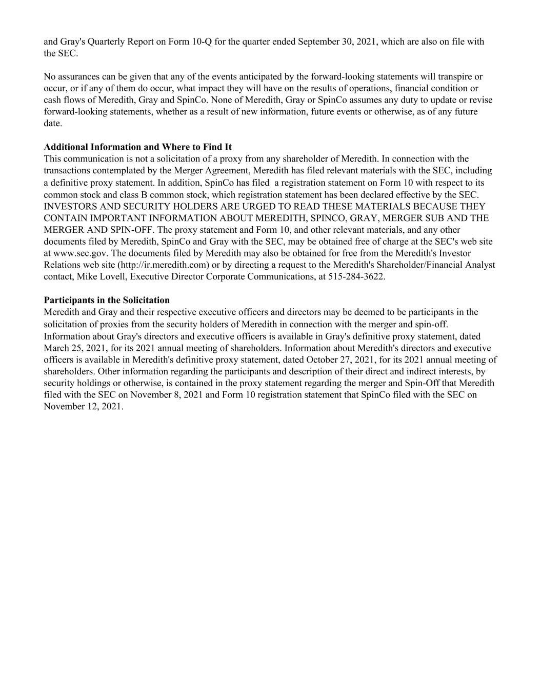 and Gray's Quarterly Report on Form 10-Q for the quarter ended September 30, 2021, which are also on file with the SEC. No assurances can be given that any of the events anticipated by the forward-looking statements will transpire or occur, or if any of them do occur, what impact they will have on the results of operations, financial condition or cash flows of Meredith, Gray and SpinCo. None of Meredith, Gray or SpinCo assumes any duty to update or revise forward-looking statements, whether as a result of new information, future events or otherwise, as of any future date. Additional Information and Where to Find It This communication is not a solicitation of a proxy from any shareholder of Meredith. In connection with the transactions contemplated by the Merger Agreement, Meredith has filed relevant materials with the SEC, including a definitive proxy statement. In addition, SpinCo has filed a registration statement on Form 10 with respect to its common stock and class B common stock, which registration statement has been declared effective by the SEC. INVESTORS AND SECURITY HOLDERS ARE URGED TO READ THESE MATERIALS BECAUSE THEY CONTAIN IMPORTANT INFORMATION ABOUT MEREDITH, SPINCO, GRAY, MERGER SUB AND THE MERGER AND SPIN-OFF. The proxy statement and Form 10, and other relevant materials, and any other documents filed by Meredith, SpinCo and Gray with the SEC, may be obtained free of charge at the SEC's web site at www.sec.gov. The documents filed by Meredith may also be obtained for free from the Meredith's Investor Relations web site (http://ir.meredith.com) or by directing a request to the Meredith's Shareholder/Financial Analyst contact, Mike Lovell, Executive Director Corporate Communications, at 515-284-3622. Participants in the Solicitation Meredith and Gray and their respective executive officers and directors may be deemed to be participants in the solicitation of proxies from the security holders of Meredith in connection with the merger and spin-off. Information about Gray's directors and executive officers is available in Gray's definitive proxy statement, dated March 25, 2021, for its 2021 annual meeting of shareholders. Information about Meredith's directors and executive officers is available in Meredith's definitive proxy statement, dated October 27, 2021, for its 2021 annual meeting of shareholders. Other information regarding the participants and description of their direct and indirect interests, by security holdings or otherwise, is contained in the proxy statement regarding the merger and Spin-Off that Meredith filed with the SEC on November 8, 2021 and Form 10 registration statement that SpinCo filed with the SEC on November 12, 2021.