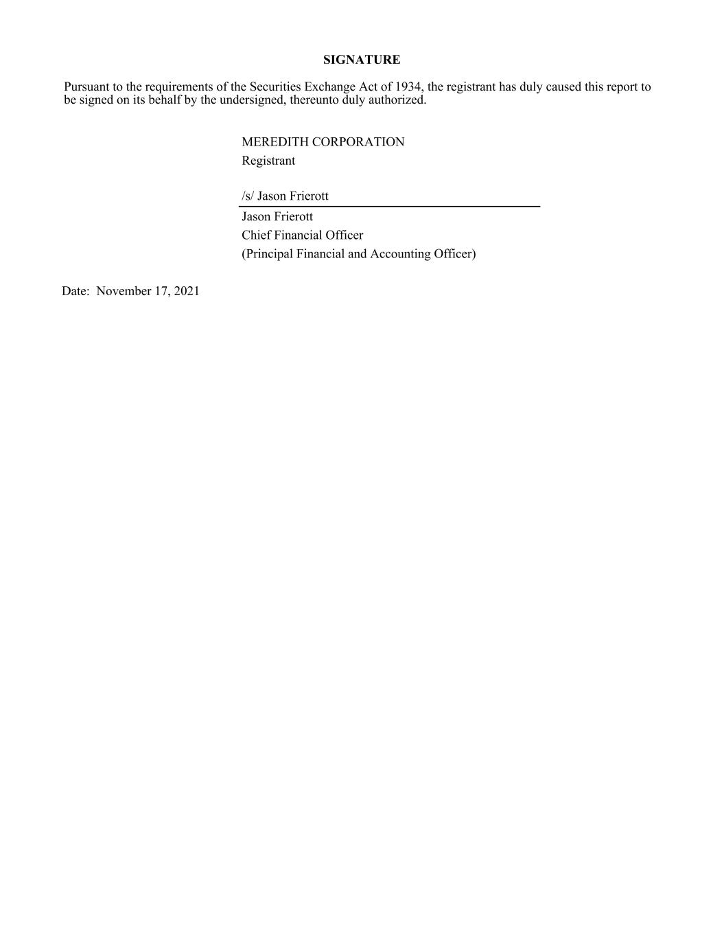 SIGNATURE Pursuant to the requirements of the Securities Exchange Act of 1934, the registrant has duly caused this report to be signed on its behalf by the undersigned, thereunto duly authorized. MEREDITH CORPORATION Registrant /s/ Jason Frierott Jason Frierott Chief Financial Officer (Principal Financial and Accounting Officer) Date: November 17, 2021