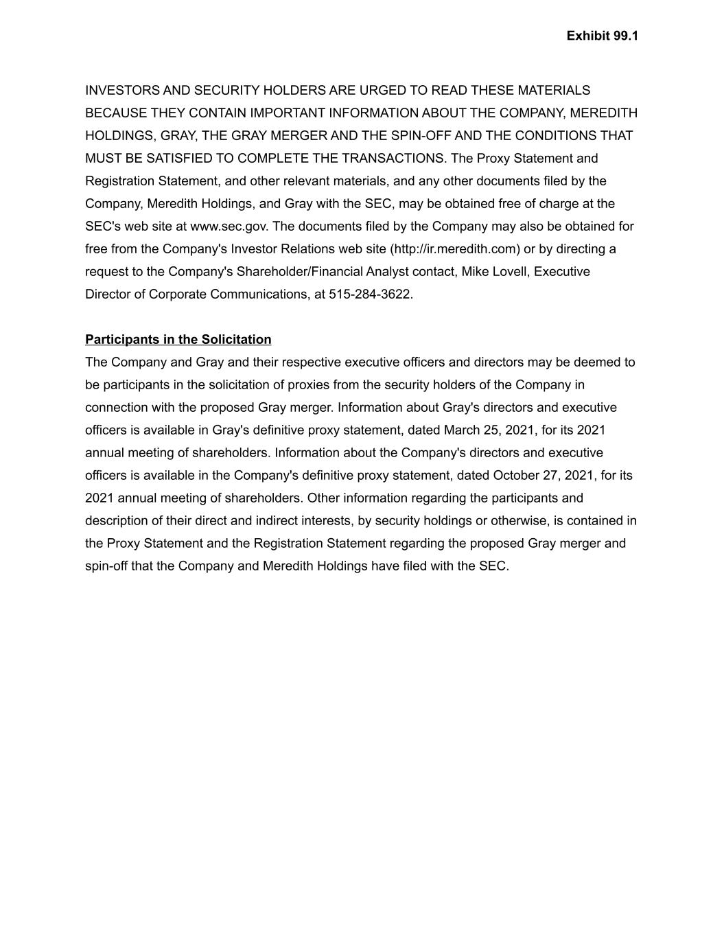 INVESTORS AND SECURITY HOLDERS ARE URGED TO READ THESE MATERIALS BECAUSE THEY CONTAIN IMPORTANT INFORMATION ABOUT THE COMPANY, MEREDITH HOLDINGS, GRAY, THE GRAY MERGER AND THE SPIN-OFF AND THE CONDITIONS THAT MUST BE SATISFIED TO COMPLETE THE TRANSACTIONS. The Proxy Statement and Registration Statement, and other relevant materials, and any other documents filed by the Company, Meredith Holdings, and Gray with the SEC, may be obtained free of charge at the SEC's web site at www.sec.gov. The documents filed by the Company may also be obtained for free from the Company's Investor Relations web site (http://ir.meredith.com) or by directing a request to the Company's Shareholder/Financial Analyst contact, Mike Lovell, Executive Director of Corporate Communications, at 515-284-3622. Participants in the Solicitation The Company and Gray and their respective executive officers and directors may be deemed to be participants in the solicitation of proxies from the security holders of the Company in connection with the proposed Gray merger. Information about Gray's directors and executive officers is available in Gray's definitive proxy statement, dated March 25, 2021, for its 2021 annual meeting of shareholders. Information about the Company's directors and executive officers is available in the Company's definitive proxy statement, dated October 27, 2021, for its 2021 annual meeting of shareholders. Other information regarding the participants and description of their direct and indirect interests, by security holdings or otherwise, is contained in the Proxy Statement and the Registration Statement regarding the proposed Gray merger and spin-off that the Company and Meredith Holdings have filed with the SEC. Exhibit 99.1