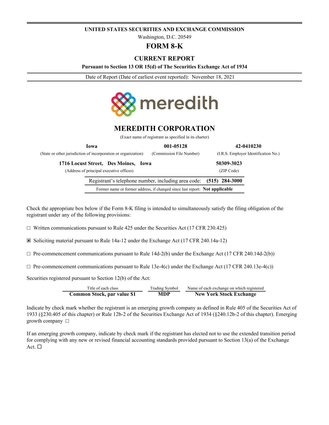 UNITED STATES SECURITIES AND EXCHANGE COMMISSION Washington, D.C. 20549 FORM 8-K CURRENT REPORT Pursuant to Section 13 OR 15(d) of The Securities Exchange Act of 1934 Date of Report (Date of earliest event reported): November 18, 2021 MEREDITH CORPORATION (Exact name of registrant as specified in its charter) Iowa 001-05128 42-0410230 (State or other jurisdiction of incorporation or organization) (Commission File Number) (I.R.S. Employer Identification No.) 1716 Locust Street, Des Moines, Iowa 50309-3023 (Address of principal executive offices) (ZIP Code) Registrant’s telephone number, including area code: (515) 284-3000 Former name or former address, if changed since last report: Not applicable Check the appropriate box below if the Form 8-K filing is intended to simultaneously satisfy the filing obligation of the registrant under any of the following provisions: ☐ Written communications pursuant to Rule 425 under the Securities Act (17 CFR 230.425) ☒ Soliciting material pursuant to Rule 14a-12 under the Exchange Act (17 CFR 240.14a-12) ☐ Pre-commencement communications pursuant to Rule 14d-2(b) under the Exchange Act (17 CFR 240.14d-2(b)) ☐ Pre-commencement communications pursuant to Rule 13e-4(c) under the Exchange Act (17 CFR 240.13e-4(c)) Securities registered pursuant to Section 12(b) of the Act: Title of each class Trading Symbol Name of each exchange on which registered Common Stock, par value $1 MDP New York Stock Exchange Indicate by check mark whether the registrant is an emerging growth company as defined in Rule 405 of the Securities Act of 1933 (§230.405 of this chapter) or Rule 12b-2 of the Securities Exchange Act of 1934 (§240.12b-2 of this chapter). Emerging growth company ☐ If an emerging growth company, indicate by check mark if the registrant has elected not to use the extended transition period for complying with any new or revised financial accounting standards provided pursuant to Section 13(a) of the Exchange Act. ¨