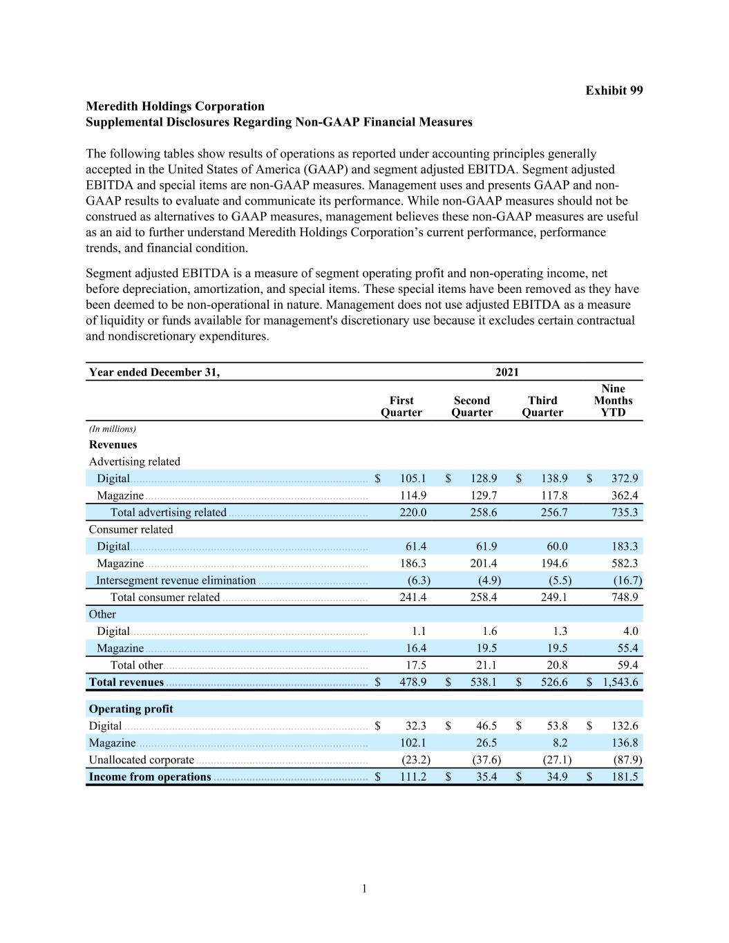 Exhibit 99 Meredith Holdings Corporation Supplemental Disclosures Regarding Non-GAAP Financial Measures The following tables show results of operations as reported under accounting principles generally accepted in the United States of America (GAAP) and segment adjusted EBITDA. Segment adjusted EBITDA and special items are non-GAAP measures. Management uses and presents GAAP and non- GAAP results to evaluate and communicate its performance. While non-GAAP measures should not be construed as alternatives to GAAP measures, management believes these non-GAAP measures are useful as an aid to further understand Meredith Holdings Corporation’s current performance, performance trends, and financial condition. Segment adjusted EBITDA is a measure of segment operating profit and non-operating income, net before depreciation, amortization, and special items. These special items have been removed as they have been deemed to be non-operational in nature. Management does not use adjusted EBITDA as a measure of liquidity or funds available for management's discretionary use because it excludes certain contractual and nondiscretionary expenditures. Year ended December 31, 2021 First Quarter Second Quarter Third Quarter Nine Months YTD (In millions) Revenues Advertising related Digital ................................................................................ $ 105.1 $ 128.9 $ 138.9 $ 372.9 Magazine ........................................................................... 114.9 129.7 117.8 362.4 Total advertising related ............................................... 220.0 258.6 256.7 735.3 Consumer related Digital ................................................................................ 61.4 61.9 60.0 183.3 Magazine ........................................................................... 186.3 201.4 194.6 582.3 Intersegment revenue elimination ..................................... (6.3) (4.9) (5.5) (16.7) Total consumer related ................................................. 241.4 258.4 249.1 748.9 Other Digital ................................................................................ 1.1 1.6 1.3 4.0 Magazine ........................................................................... 16.4 19.5 19.5 55.4 Total other ..................................................................... 17.5 21.1 20.8 59.4 Total revenues .................................................................... $ 478.9 $ 538.1 $ 526.6 $ 1,543.6 Operating profit Digital .................................................................................. $ 32.3 $ 46.5 $ 53.8 $ 132.6 Magazine .............................................................................. 102.1 26.5 8.2 136.8 Unallocated corporate .......................................................... (23.2) (37.6) (27.1) (87.9) Income from operations .................................................... $ 111.2 $ 35.4 $ 34.9 $ 181.5 1