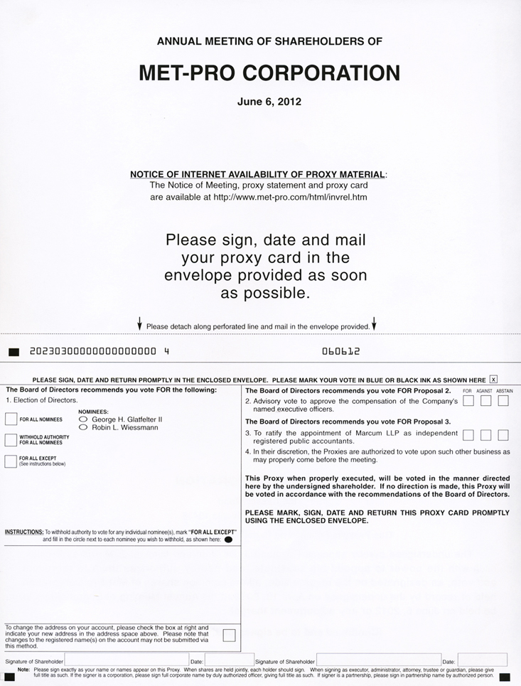 Please note that under New York Stock Exchange rules, your broker cannot vote your shares on your behalf with respect to the election of Directors until it receives your voting instructions. Thus, if the Met-Pro Corporation shares that you own are registered in the name of your broker (“street name”), in the absence of your specific instructions on your executed proxy card, your broker will not vote your shares with respect to any of the named nominees to the Company’s Board of Directors. Accordingly, we encourage you to give specific voting instructions to your broker.