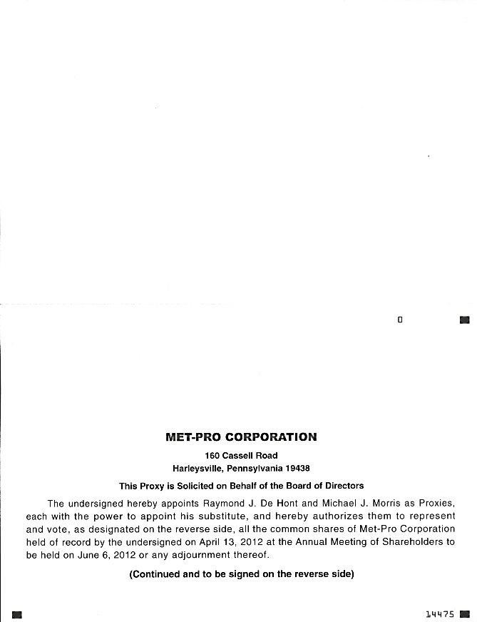 THE COMPANY WILL FURNISH WITHOUT CHARGE TO EACH PERSON WHOSE PROXY IS BEING SOLICITED, UPON THE WRITTEN REQUEST OF ANY SUCH PERSON, A COPY OF THE COMPANY’S ANNUAL REPORT ON FORM 10-K/A FOR THE FISCAL YEAR ENDED JANUARY 31, 2012, AS FILED WITH THE SECURITIES AND EXCHANGE COMMISSION, INCLUDING THE FINANCIAL STATEMENTS AND SCHEDULES THERETO. REQUESTS FOR COPIES OF SUCH REPORT SHOULD BE DIRECTED TO NEAL E. MURPHY, SECRETARY, MET-PRO CORPORATION, 160 CASSELL ROAD, P.O. BOX 144, HARLEYSVILLE, PENNSYLVANIA 19438.