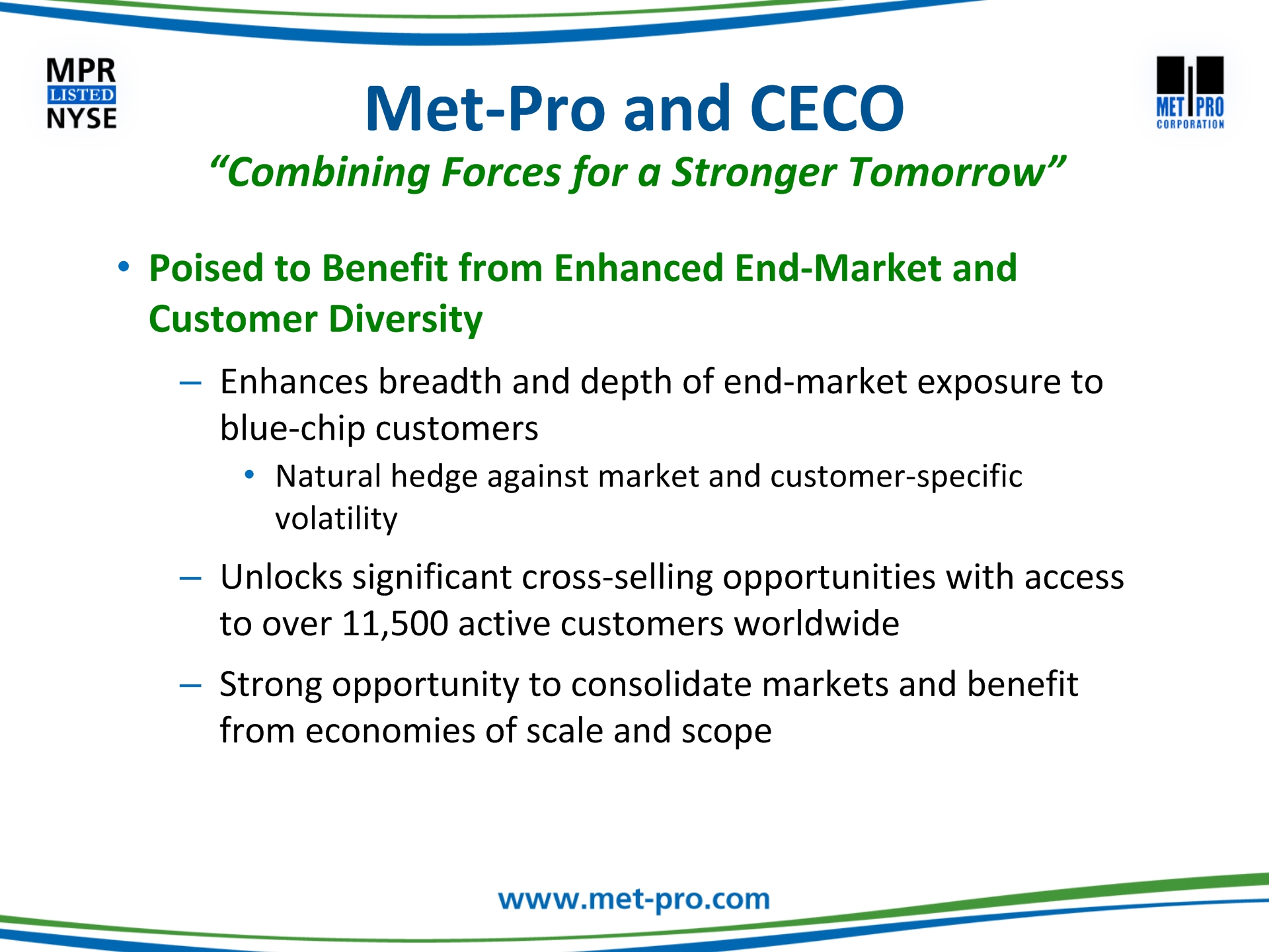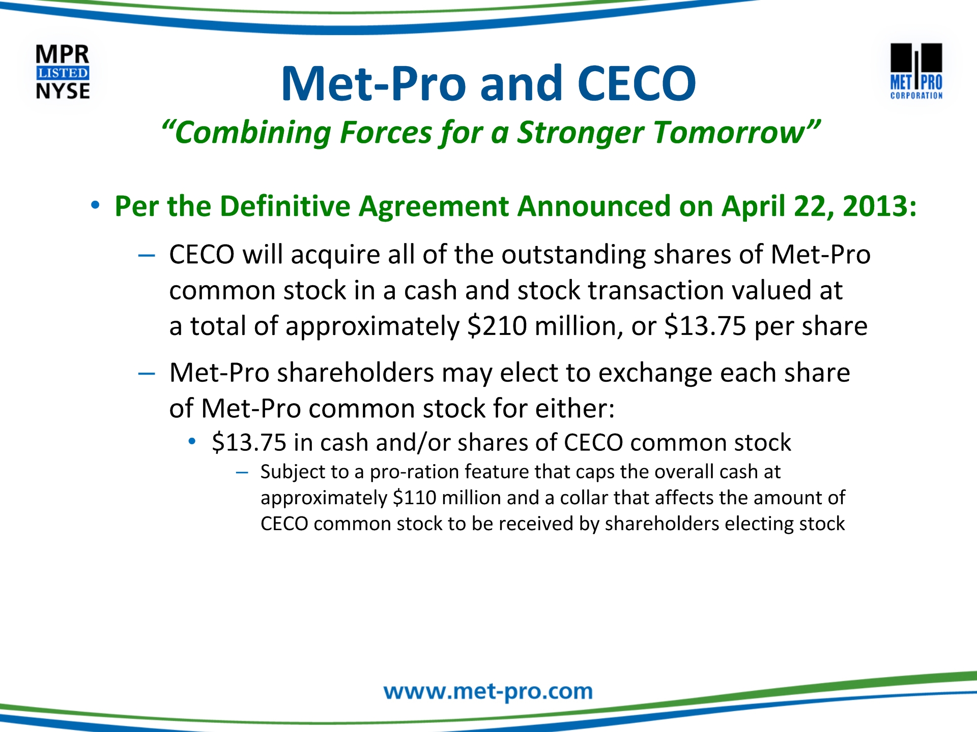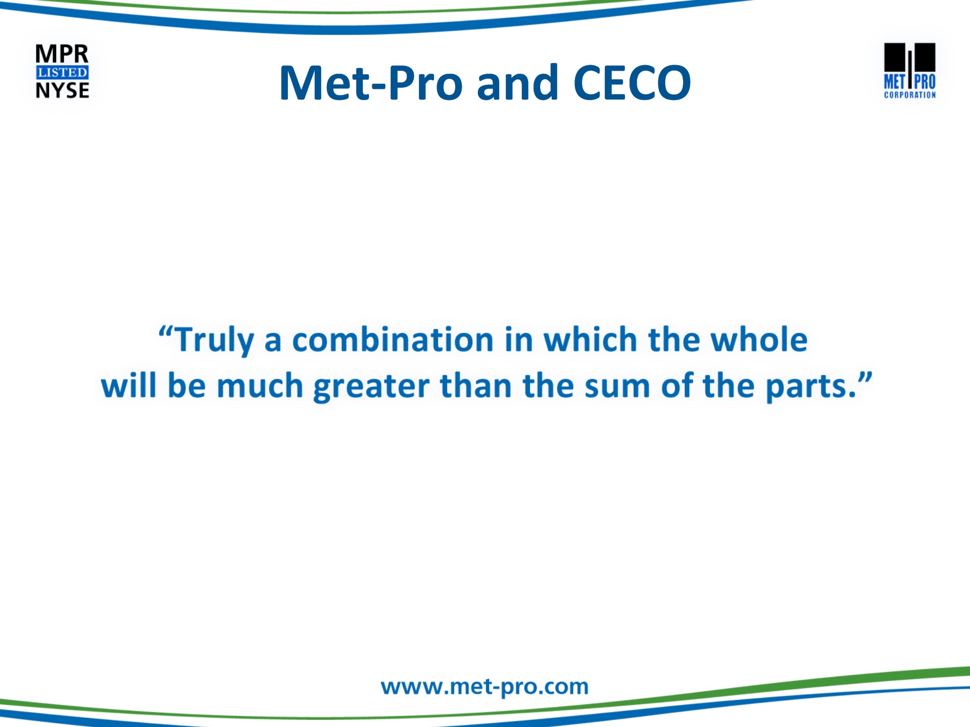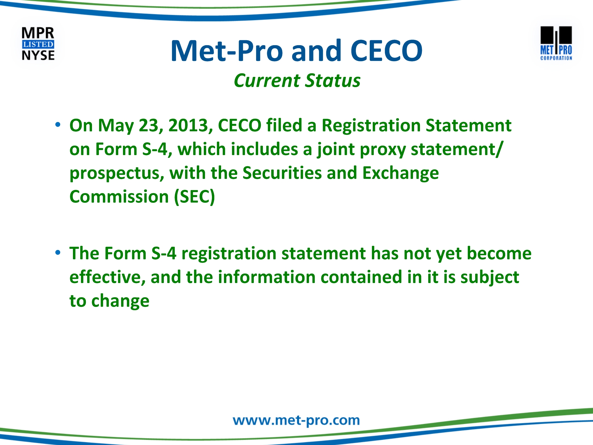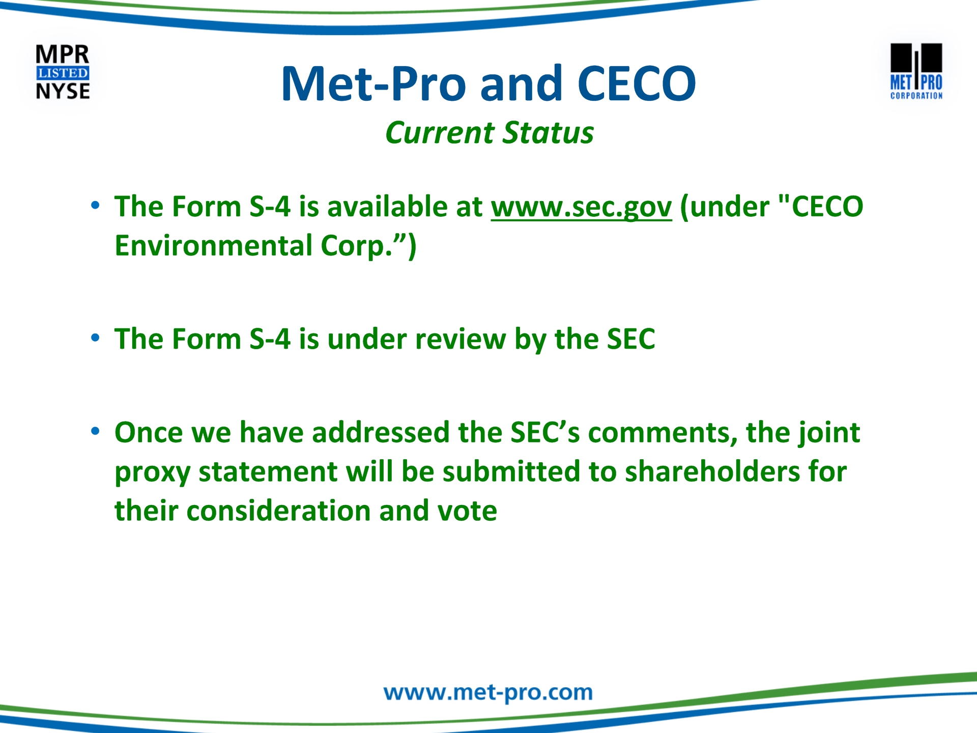 Click to edit Master title style Click to edit Master text stylesSecond levelThird levelFourth levelFifth level This communication may be deemed solicitation material in respect of the proposed acquisition of Met-Pro by CECO. In connection with the proposed merger, Met-Pro and CECO have filed with the Securities and Exchange Commission (“SEC”) a registration statement on Form S-4, which includes a prospectus/proxy statement. The prospectus/proxy statement, will be mailed to the shareholders of Met-Pro in advance of the special meeting. BEFORE MAKING ANY VOTING DECISIONS, SHAREHOLDERS OF MET-PRO ARE URGED TO CAREFULLY READ THE REGISTRATION STATEMENT, INCLUDING THE PROSPECTUS/PROXY STATEMENT, AND OTHER RELEVANT MATERIALS WHEN THEY BECOME AVAILABLE BECAUSE THEY WILL CONTAIN IMPORTANT INFORMATION ABOUT MET-PRO AND THE PROPOSED MERGER. Shareholders may obtain a free copy of the registration statement, including the prospectus/proxy statement, and any other relevant documents filed by Met-Pro and CECO with the SEC (when available) at the SEC’s website at www.sec.gov, at Met-Pro’s Investor Relations website at www.met-pro.com/investor-relations, or by directing a request to, Met-Pro Corporation, 160 Cassell Road, P.O. Box 144, Harleysville, PA 19438, Attention: Investor Relations, or calling (215) 723-6751 or emailing at mpr@met-pro.com. Additional Information and Where to Find it