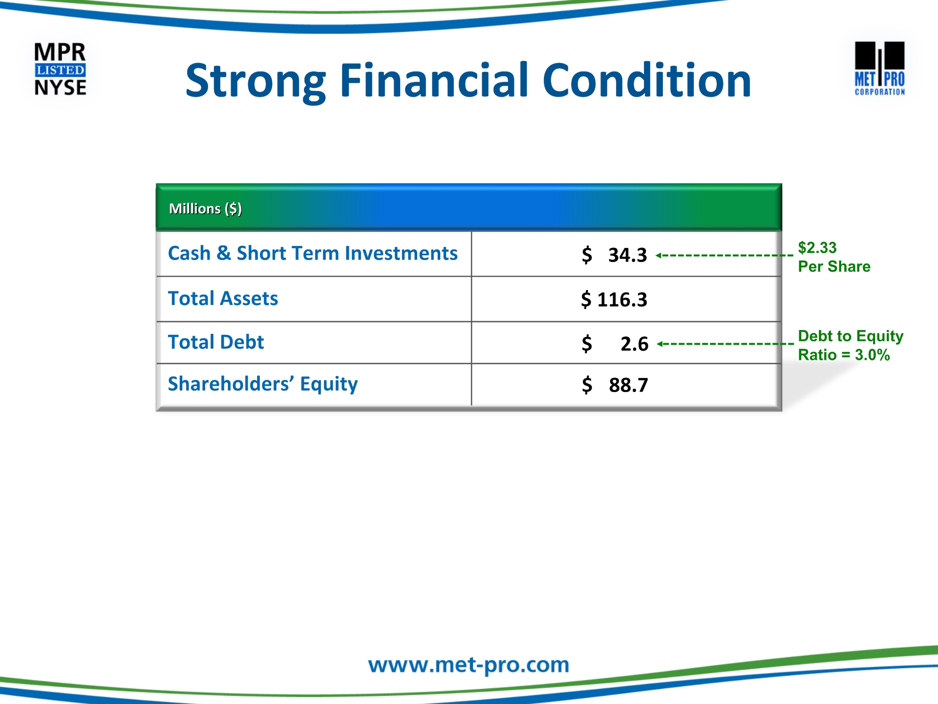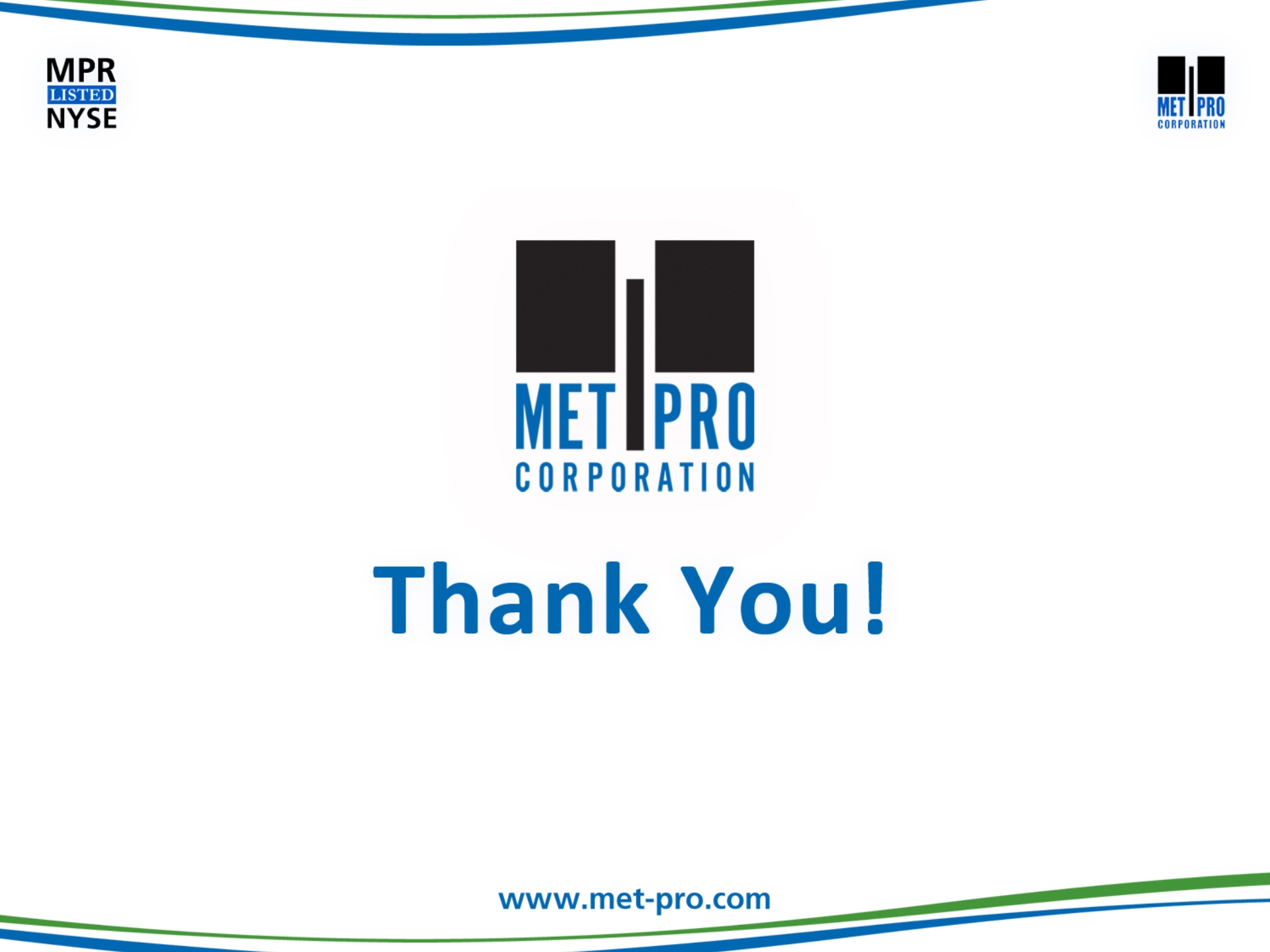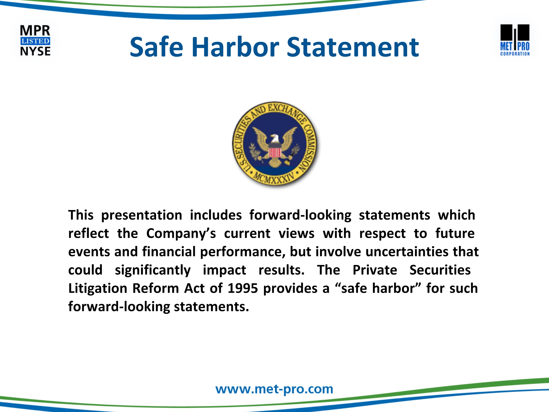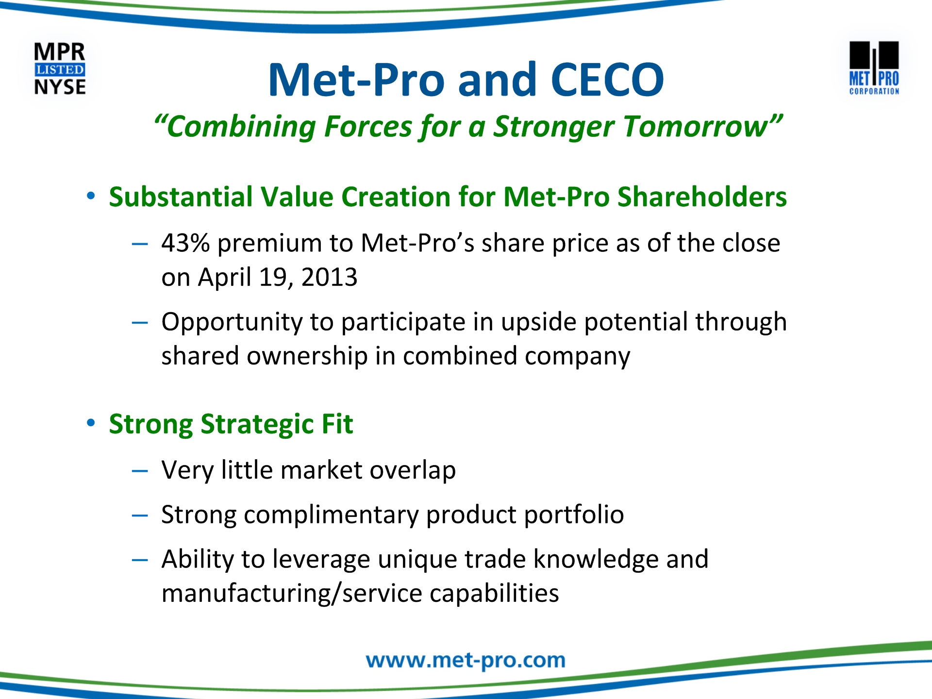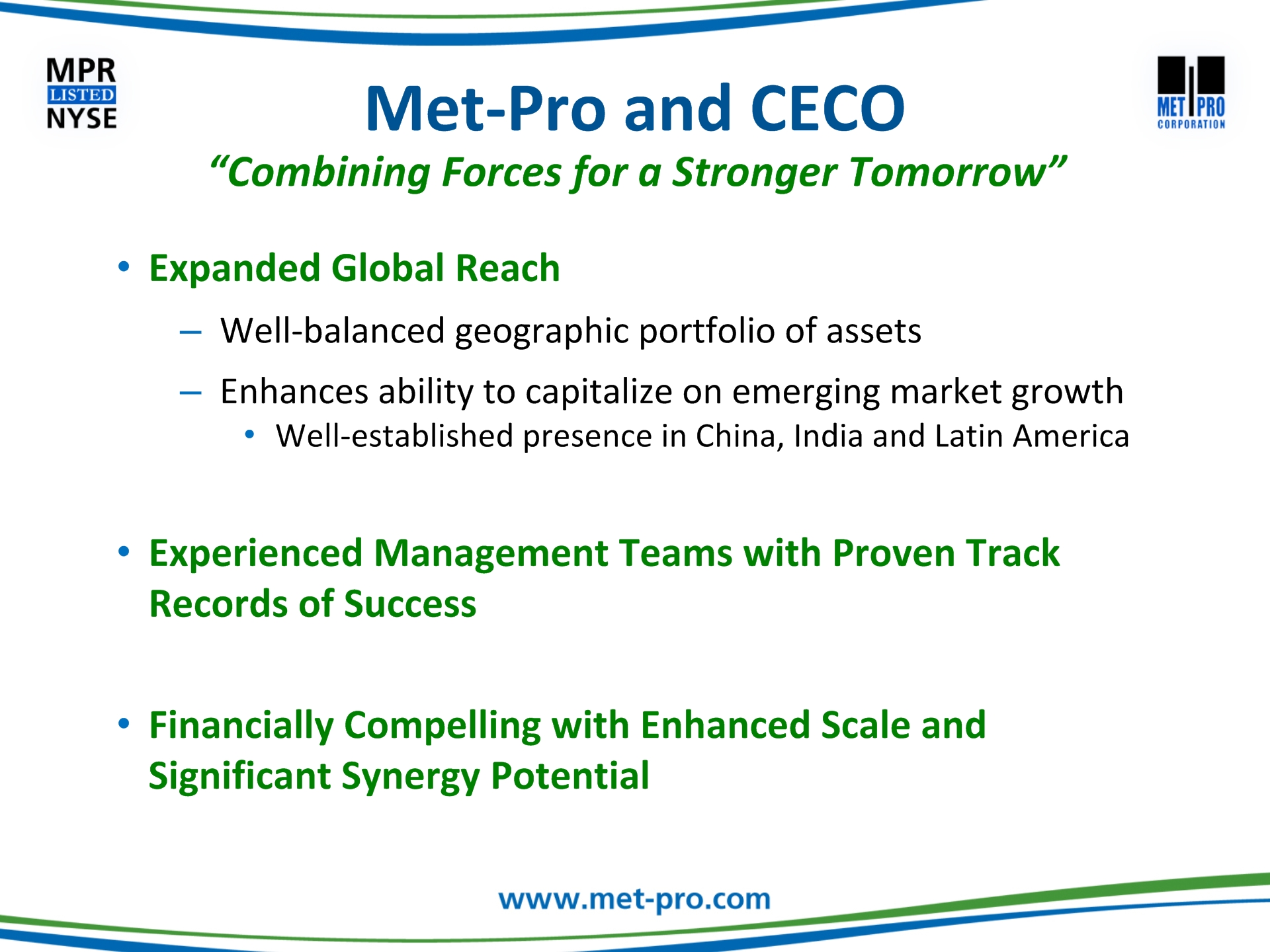 Click to edit Master title style Click to edit Master text stylesSecond levelThird levelFourth levelFifth level This communication may be deemed solicitation material in respect of the proposed acquisition of Met-Pro by CECO. In connection with the proposed merger, Met-Pro and CECO have filed with the Securities and Exchange Commission (“SEC”) a registration statement on Form S-4, which includes a prospectus/proxy statement. The prospectus/proxy statement, will be mailed to the shareholders of Met-Pro in advance of the special meeting. BEFORE MAKING ANY VOTING DECISIONS, SHAREHOLDERS OF MET-PRO ARE URGED TO CAREFULLY READ THE REGISTRATION STATEMENT, INCLUDING THE PROSPECTUS/PROXY STATEMENT, AND OTHER RELEVANT MATERIALS WHEN THEY BECOME AVAILABLE BECAUSE THEY WILL CONTAIN IMPORTANT INFORMATION ABOUT MET-PRO AND THE PROPOSED MERGER. Shareholders may obtain a free copy of the registration statement, including the prospectus/proxy statement, and any other relevant documents filed by Met-Pro and CECO with the SEC (when available) at the SEC’s website at www.sec.gov, at Met-Pro’s Investor Relations website at www.met-pro.com/investor-relations, or by directing a request to, Met-Pro Corporation, 160 Cassell Road, P.O. Box 144, Harleysville, PA 19438, Attention: Investor Relations, or calling (215) 723-6751 or emailing at mpr@met-pro.com. Additional Information and Where to Find it