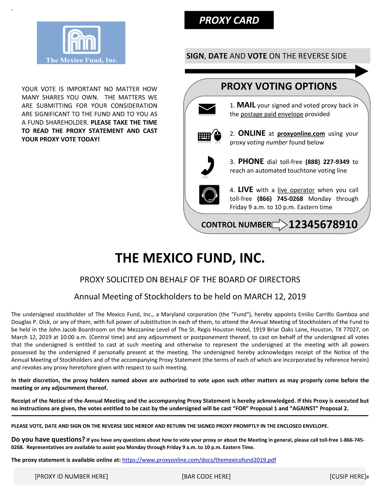 This Proxy Statement is furnished in connection with the solicitation of proxies by the Board of Directors (“Board”) of The Mexico Fund, Inc., a Maryland corporation (the “Fund”), to be exercised at the Annual Meeting of Stockholders of the Fund (the “Meeting”) to be held in the John Jacob Boardroom on the Mezzanine Level of the St. Regis Hotel, located at 1919 Briar Oaks Lane, Houston, Texas 77027, at 10:00 am CST and at any adjournment or postponement thereof. The approximate mailing date of this Proxy Statement is February 1, 2019 or as soon as practicable thereafter.
