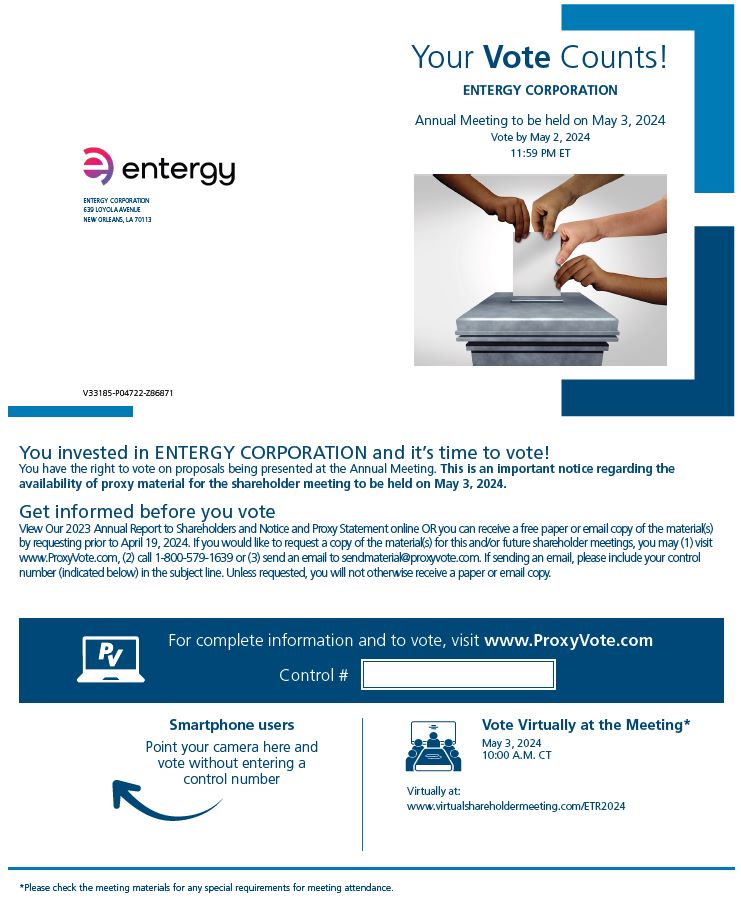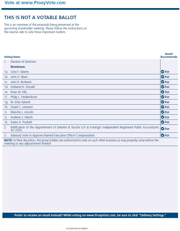 639 LOYOLA AVENUE NEW ORLEANS, LA 70113 ENTERGY CORPORATION Annual Meeting to be held on May 3, 2024 Vote by May 2, 2024 11:59 PM ET You invested in ENTERGY CORPORATION and it’s time to vote! You have the right to vote on proposals