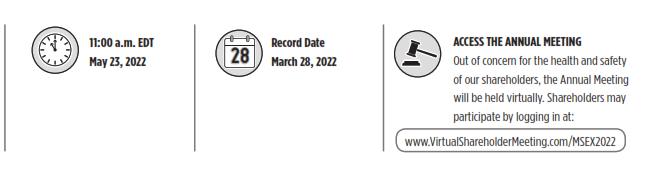 To support the health and well-being or our shareholders, the Company will have a virtual only Annual Meeting in 2022, conducted exclusively via audiocast at www.virtualshareholdermeeting.com/MSEX2022. There will not be a physical location for our Annual Meeting and you will not be able to attend the meeting in person.