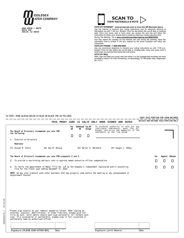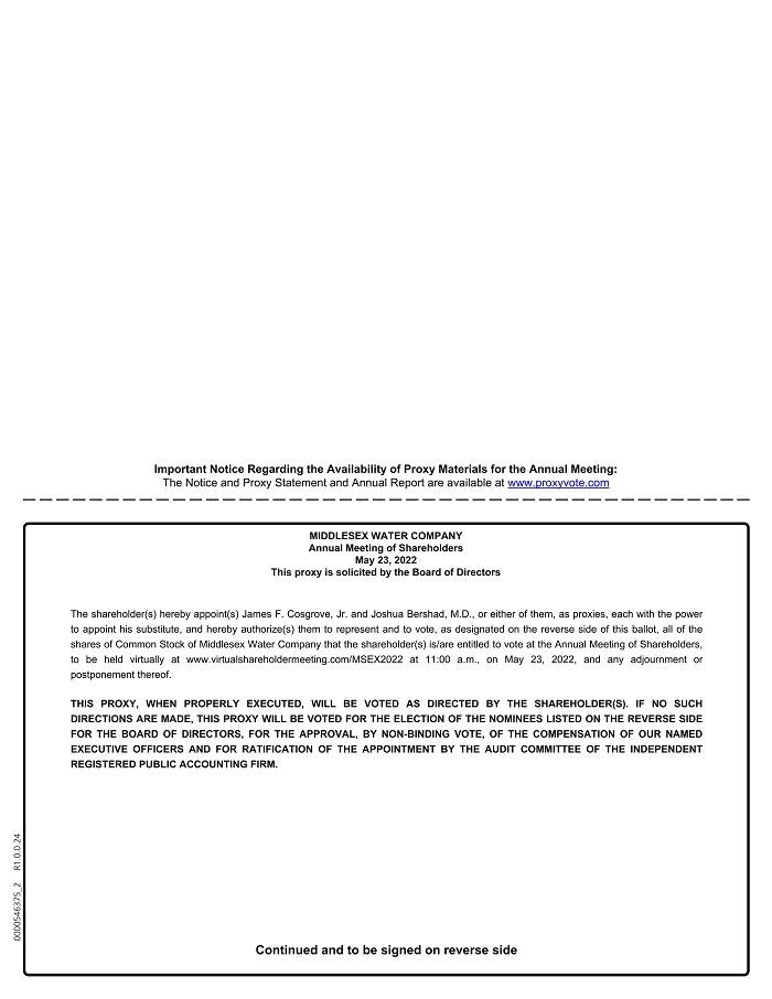 Important Notice Regarding the Availability of Proxy Materials for the Annual Meeting: The Notice and Proxy Statement and Annual Report are available at www.proxyvote.com MIDDLESEX WATER COMPANY Annual Meeting of Shareholders May 23, 2022 This proxy is solicited by the Board of Directors The shareholder(s) hereby appoint(s) James F. Cosgrove, Jr. and Joshua Bershad, M.D., or either of them, as proxies, each with the power to appoint his substitute, and hereby authorize(s) them to represent and to vote, as designated on the reverse side of this ballot, all of the shares of Common Stock of Middlesex Water Company that the shareholder(s) is/are entitled to vote at the Annual Meeting of Shareholders, to be held virtually at www.virtualshareholdermeeting.com/MSEX2022 at 11:00 a.m., on May 23, 2022, and any adjournment or postponement thereof. THIS PROXY, WHEN PROPERLY EXECUTED, WILL BE VOTED AS DIRECTED BY THE SHAREHOLDER(S). IF NO SUCH DIRECTIONS ARE MADE, THIS PROXY WILL BE VOTED FOR THE ELECTION OF THE NOMINEES LISTED ON THE REVERSE SIDE FOR THE BOARD OF DIRECTORS, FOR THE APPROVAL, BY NON-BINDING VOTE, OF THE COMPENSATION OF OUR NAMED EXECUTIVE OFFICERS AND FOR RATIFICATION OF THE APPOINTMENT BY THE AUDIT COMMITTEE OF THE INDEPENDENT REGISTERED PUBLIC ACCOUNTING FIRM. Continued and to be signed on reverse side