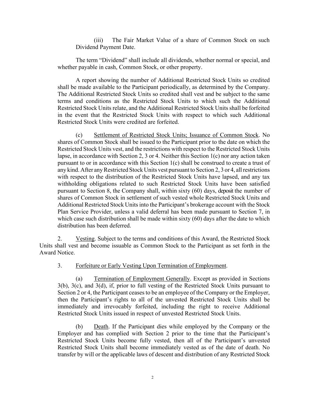 2 (iii) The Fair Market Value of a share of Common Stock on such Dividend Payment Date. The term “Dividend” shall include all dividends, whether normal or special, and whether payable in cash, Common Stock, or other property. A report showing the number of Additional Restricted Stock Units so credited shall be made available to the Participant periodically, as determined by the Company. The Additional Restricted Stock Units so credited shall vest and be subject to the same terms and conditions as the Restricted Stock Units to which such the Additional Restricted Stock Units relate, and the Additional Restricted Stock Units shall be forfeited in the event that the Restricted Stock Units with respect to which such Additional Restricted Stock Units were credited are forfeited. (c) Settlement of Restricted Stock Units; Issuance of Common Stock. No shares of Common Stock shall be issued to the Participant prior to the date on which the Restricted Stock Units vest, and the restrictions with respect to the Restricted Stock Units lapse, in accordance with Section 2, 3 or 4. Neither this Section 1(c) nor any action taken pursuant to or in accordance with this Section 1(c) shall be construed to create a trust of any kind. After any Restricted Stock Units vest pursuant to Section 2, 3 or 4, all restrictions with respect to the distribution of the Restricted Stock Units have lapsed, and any tax withholding obligations related to such Restricted Stock Units have been satisfied pursuant to Section 8, the Company shall, within sixty (60) days, deposit the number of shares of Common Stock in settlement of such vested whole Restricted Stock Units and Additional Restricted Stock Units into the Participant’s brokerage account with the Stock Plan Service Provider, unless a valid deferral has been made pursuant to Section 7, in which case such distribution shall be made within sixty (60) days after the date to which distribution has been deferred. 2. Vesting. Subject to the terms and conditions of this Award, the Restricted Stock Units shall vest and become issuable as Common Stock to the Participant as set forth in the Award Notice. 3. Forfeiture or Early Vesting Upon Termination of Employment. (a) Termination of Employment Generally. Except as provided in Sections 3(b), 3(c), and 3(d), if, prior to full vesting of the Restricted Stock Units pursuant to Section 2 or 4, the Participant ceases to be an employee of the Company or the Employer, then the Participant’s rights to all of the unvested Restricted Stock Units shall be immediately and irrevocably forfeited, including the right to receive Additional Restricted Stock Units issued in respect of unvested Restricted Stock Units. (b) Death. If the Participant dies while employed by the Company or the Employer and has complied with Section 2 prior to the time that the Participant’s Restricted Stock Units become fully vested, then all of the Participant’s unvested Restricted Stock Units shall become immediately vested as of the date of death. No transfer by will or the applicable laws of descent and distribution of any Restricted Stock