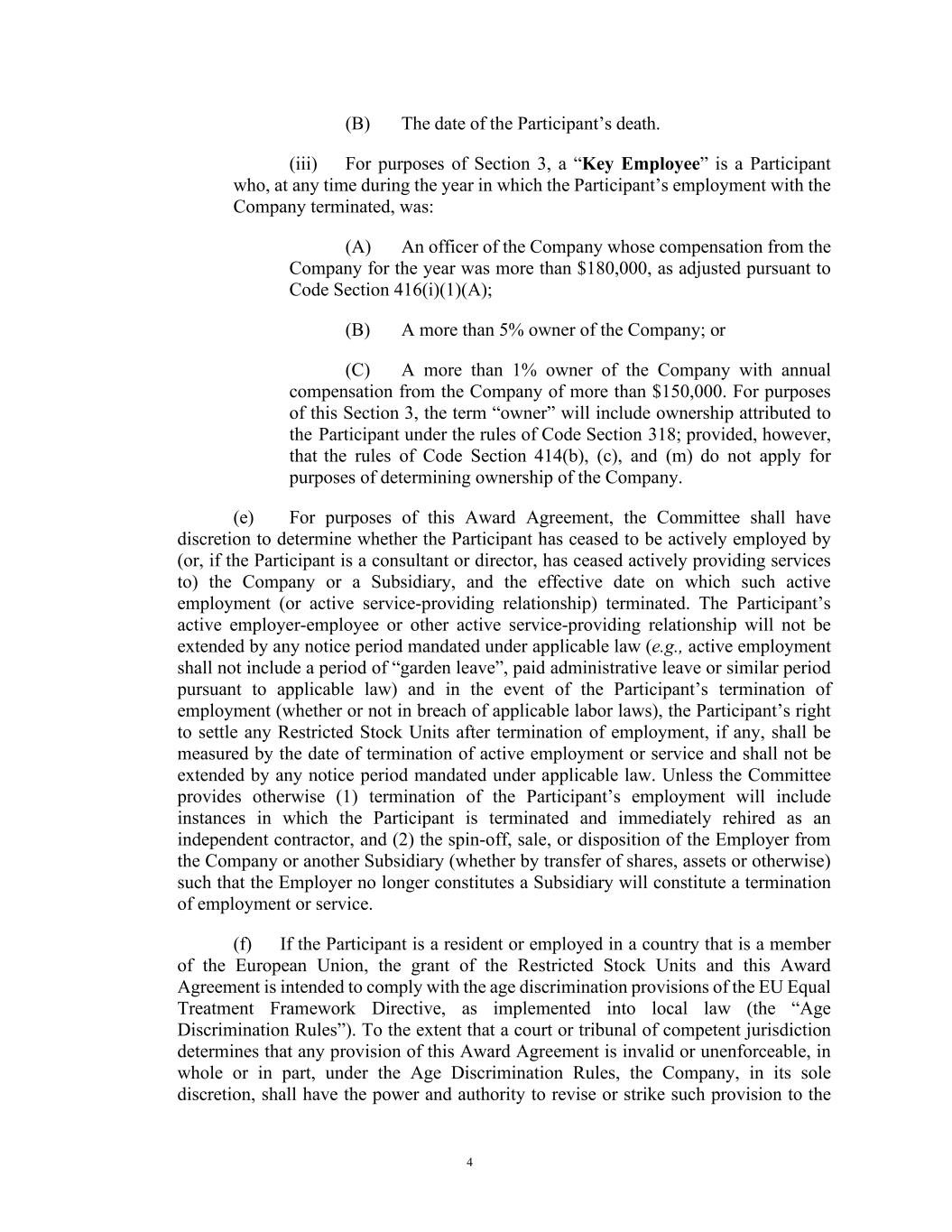 4 (B) The date of the Participant’s death. (iii) For purposes of Section 3, a “Key Employee” is a Participant who, at any time during the year in which the Participant’s employment with the Company terminated, was: (A) An officer of the Company whose compensation from the Company for the year was more than $180,000, as adjusted pursuant to Code Section 416(i)(1)(A); (B) A more than 5% owner of the Company; or (C) A more than 1% owner of the Company with annual compensation from the Company of more than $150,000. For purposes of this Section 3, the term “owner” will include ownership attributed to the Participant under the rules of Code Section 318; provided, however, that the rules of Code Section 414(b), (c), and (m) do not apply for purposes of determining ownership of the Company. (e) For purposes of this Award Agreement, the Committee shall have discretion to determine whether the Participant has ceased to be actively employed by (or, if the Participant is a consultant or director, has ceased actively providing services to) the Company or a Subsidiary, and the effective date on which such active employment (or active service-providing relationship) terminated. The Participant’s active employer-employee or other active service-providing relationship will not be extended by any notice period mandated under applicable law (e.g., active employment shall not include a period of “garden leave”, paid administrative leave or similar period pursuant to applicable law) and in the event of the Participant’s termination of employment (whether or not in breach of applicable labor laws), the Participant’s right to settle any Restricted Stock Units after termination of employment, if any, shall be measured by the date of termination of active employment or service and shall not be extended by any notice period mandated under applicable law. Unless the Committee provides otherwise (1) termination of the Participant’s employment will include instances in which the Participant is terminated and immediately rehired as an independent contractor, and (2) the spin-off, sale, or disposition of the Employer from the Company or another Subsidiary (whether by transfer of shares, assets or otherwise) such that the Employer no longer constitutes a Subsidiary will constitute a termination of employment or service. (f) If the Participant is a resident or employed in a country that is a member of the European Union, the grant of the Restricted Stock Units and this Award Agreement is intended to comply with the age discrimination provisions of the EU Equal Treatment Framework Directive, as implemented into local law (the “Age Discrimination Rules”). To the extent that a court or tribunal of competent jurisdiction determines that any provision of this Award Agreement is invalid or unenforceable, in whole or in part, under the Age Discrimination Rules, the Company, in its sole discretion, shall have the power and authority to revise or strike such provision to the